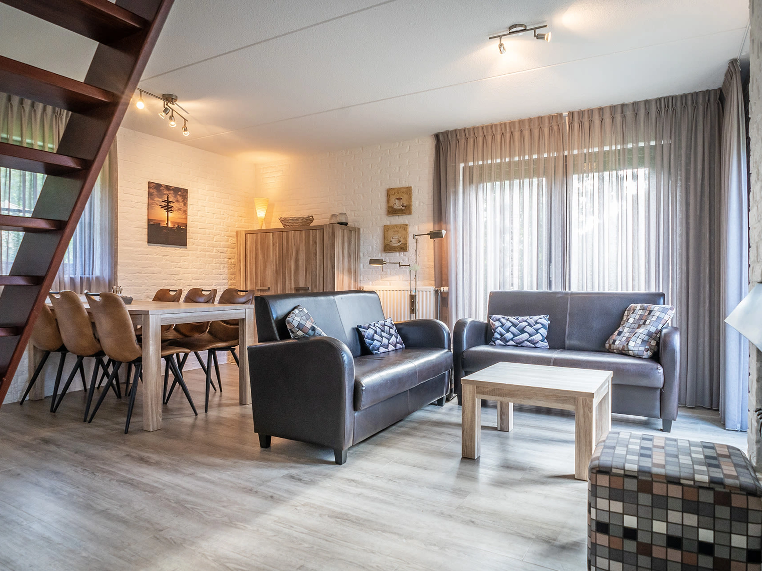 You enter into a cozy living room with a comfortable seating area and TV. Adjacent is the dining area, next to which is the semi-open kitchen, which is equipped with a dishwasher, microwave, and refrigerator. On the ground floor of this detached holiday home, there is a bedroom with two single beds and a bathroom with a shower, sink, and toilet. Upstairs, there are two more bedrooms, both with two single beds. You have access to a spacious garden with a terrace, complete with garden furniture. There is also a small bicycle shed.