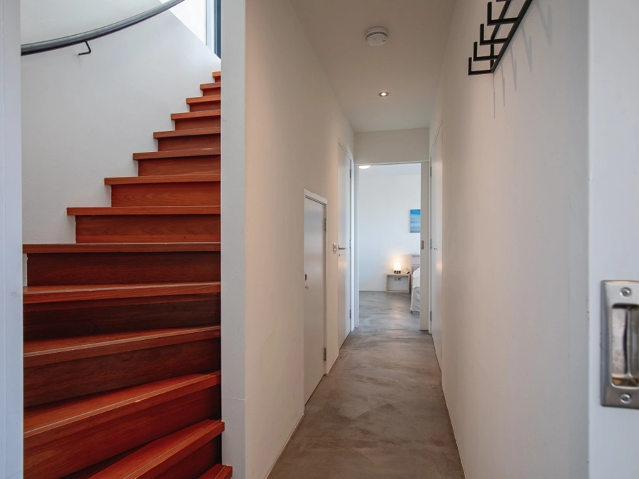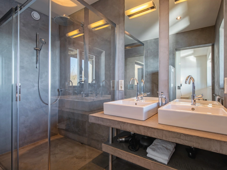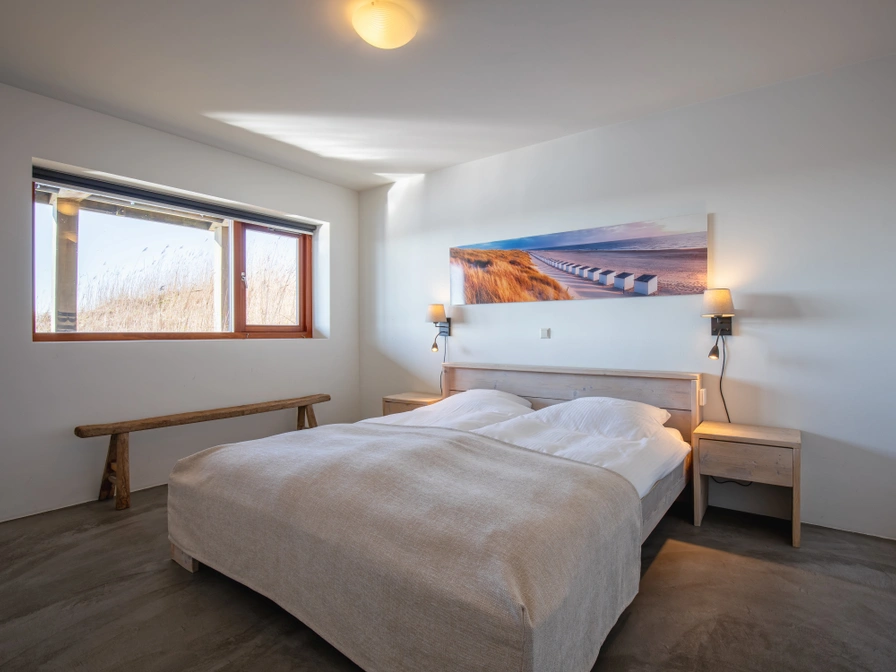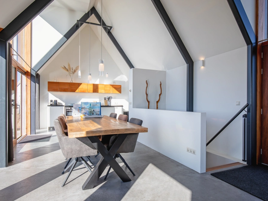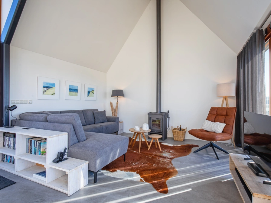 Entrance, large living room with extra-high ceilings and large windows spanning the entire length of the house (10 meters). Here you'll find a comfortable lounge sofa with a cozy wood-burning stove (bring your own wood), a soundbar, and a smart TV with Airplay 2 and Google Chromecast. The large wooden dining table comfortably seats a large group. The open-plan kitchen, beautifully crafted from Belgian bluestone and afzelia wood, is equipped with a refrigerator with freezer compartment, a combination oven, a dishwasher, and a Nespresso machine. The kitchen is complete with a cooking island with a 6-burner induction cooktop and an advanced downdraft extractor fan. Luxury at its finest: two bedrooms (with extra-long beds) each have their own en suite bathroom and are located in the basement, accessible via a wooden staircase. One of the bathrooms has a walk-in shower plus an additional toilet and bidet, the other a walk-in shower. Both bathrooms have double sinks, and there is also a separate toilet. The laundry room is equipped with a washing machine and dryer. A coat rack is located in the basement. Holiday home Rust on Texel has a huge terrace of 75 m2 with a large dining table, comfortable adirondack loungers and a large parasol.