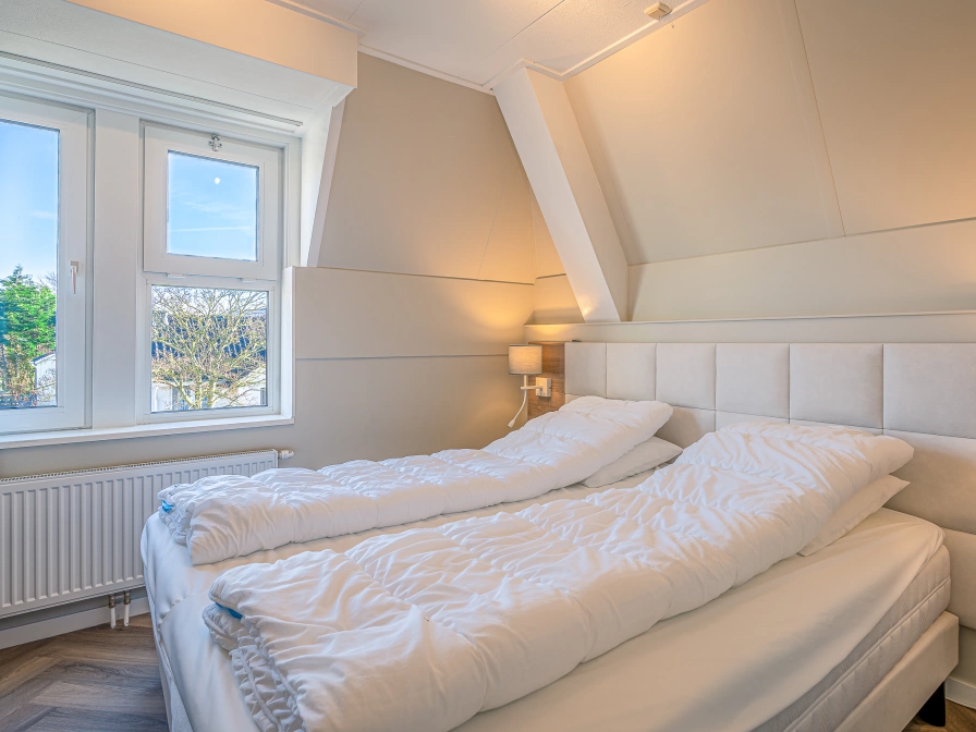 This comfortable 4-person apartment is located on the second floor. The cozy living room has a sitting area and TV. There is a dining area with a dining table for 4 people. The open kitchen is fully equipped with various built-in appliances. There are two bedrooms, each with two comfortable single box-spring beds and TV. The bathroom has a walk-in shower and sink. There is a separate toilet. The balcony is accessible from the living room through a sliding door and is located on the west. Garden furniture is available.