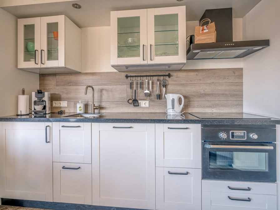 Comfortable 4-person apartment on the first floor. The cozy living room has a sitting area and TV. There is a dining area with a dining table for 4 people. The open kitchen is fully equipped with various built-in appliances. There are two bedrooms, each with two comfortable single box-spring beds and TV. The bathroom has a bath, walk-in shower and sink. Separate toilet. The balcony is accessible from the living room through a sliding door and is located on the west. Garden furniture is available.