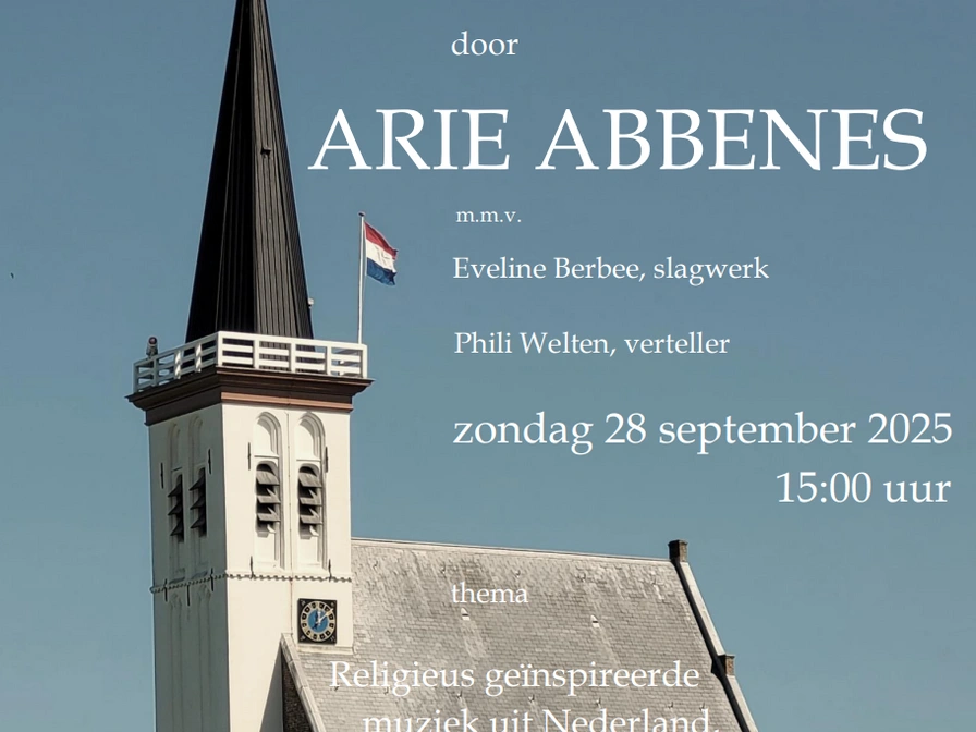 Sunday, September 28, 2025 To commemorate the 600th anniversary of the Den Hoorn village church, a concert will be held in that church on Sunday afternoon, September 28, 2025, at 3:00 PM by Arie Abbenes on the Scheuer organ, accompanied by Evelien Berbee, percussion, and Phili Welten, narrator. The program consists of religiously inspired music from the Netherlands, France, Germany, and Italy from the 16th to the 19th centuries and includes works by J.P. Sweelinck, Q. van Blankenburg, C.F. Hurlebusch, J. Pachelbel, J.-F. Dandrieu, J. Kuhnau, and D. da Bergamo. The organ in the Hoorn village church was built in the classical tradition by J.C. Scheuer and Son from Zwolle in 1857 and remains entirely in its original state. This concert demonstrates how well this beautiful organ lends itself to music from a wide range of stylistic periods. During his long career, Arie Abbenes was the city carillonneur of Utrecht, Eindhoven, Asten, Son, and Oirschot. He taught at the Netherlands Carillon School/Utrecht Conservatory and at the School of Music at Indiana University (USA). He currently works as a freelance carillonneur, carillon restoration consultant, and organist at various churches on Texel. Evelien Berbee has been a member of the D.E.K. Music Association in Den Hoorn for over 30 years. Through majorettes and drum band, she found her place within the orchestra, initially as a flautist, but for several years now as a percussionist. Phili Welten has been involved as narrator in numerous carillon and organ concerts in the Netherlands and Flanders. Location: Hoornderkerk, Kerkstraat Start: 3:00 PM The concerts are free. A voluntary contribution makes these concerts possible.