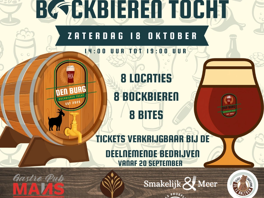 Saturday, October 18 Join this Bock Beer Tour in Den Burg! Eight locations, eight beers, eight bites. The tour starts at 2:00 PM and lasts until 7:00 PM. Enjoy a delicious bock beer and a snack at eight different venues! Tickets are available starting September 20 at participating venues: Smakelijk & Meer Café de Slock Texels Tasting Room De Zwaan De Kastanjeboom Cinema Texel De Twaalf Balcken Eilandbar Mans Gastropub Mans