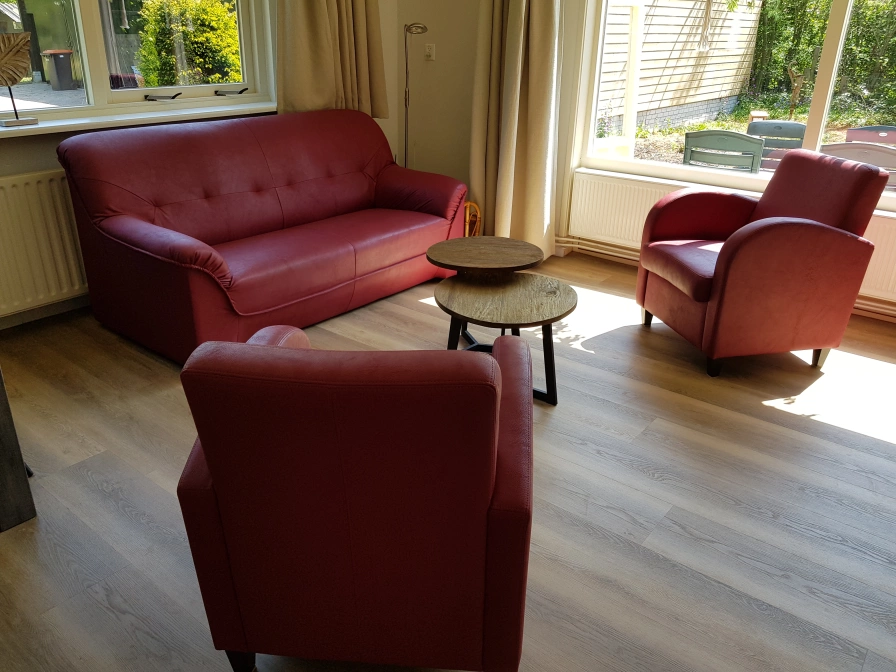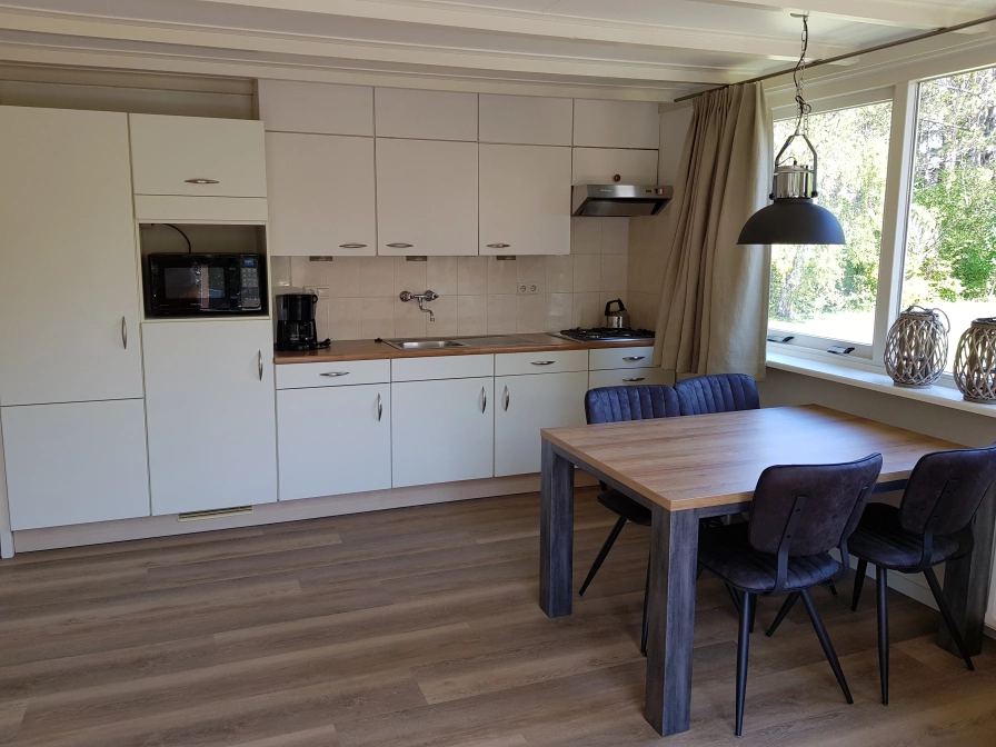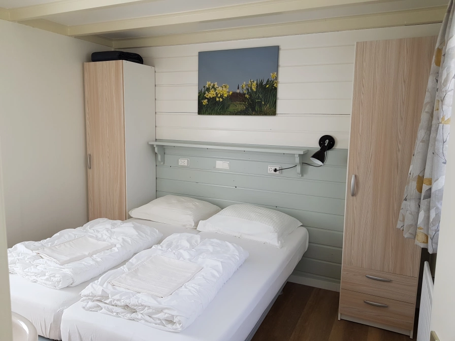 De woonkamer heeft een zithoek met tv. De open keuken is ingericht met koelkast, combimagnetron en een eethoek. Er zijn twee slaapkamers, waarvan één met twee eenpersoonsbedden. In de andere slaapkamer staat een eenpersoonsbed. Een van de slaapkamers heeft een wastafel. De badkamer (2 x 1 meter) heeft douche en toilet. Dit vakantiehuis heeft een terras op het zuiden.