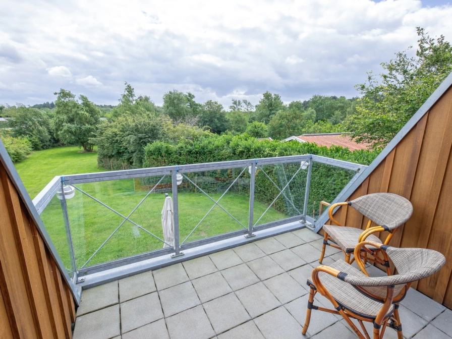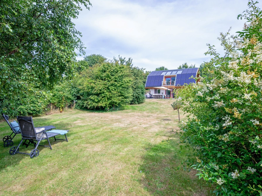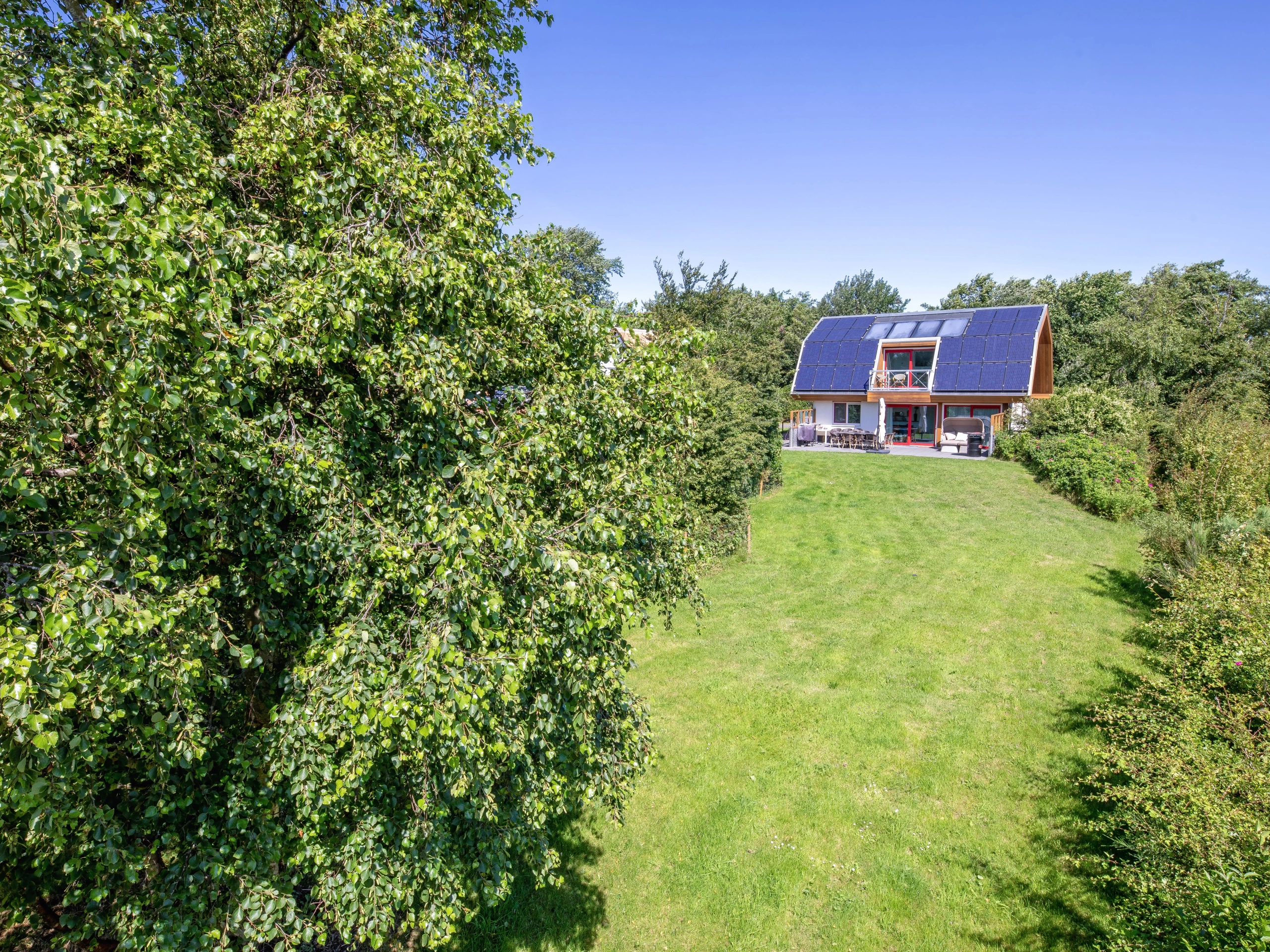 Het huis heeft een grote, beschutte en omheinde tuin van meer dan 1.400 m2, omgeven door bomen en struiken. De tuin is volledig omheind. Met een woonoppervlakte van meer dan 200 m2 over 3 etages biedt het vakantiehuis ruimte voor 10 personen. Door middel van zonnepanelen en isolatie is het huis volledig energieneutraal. De begane grond is drempelloos met deuren van 90 centimeter breed.