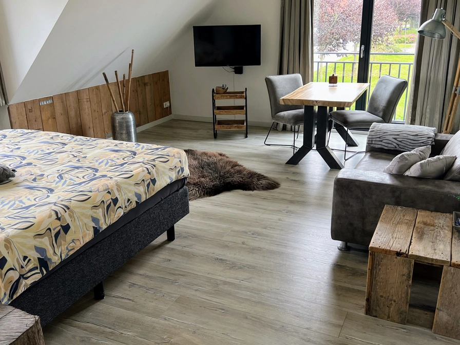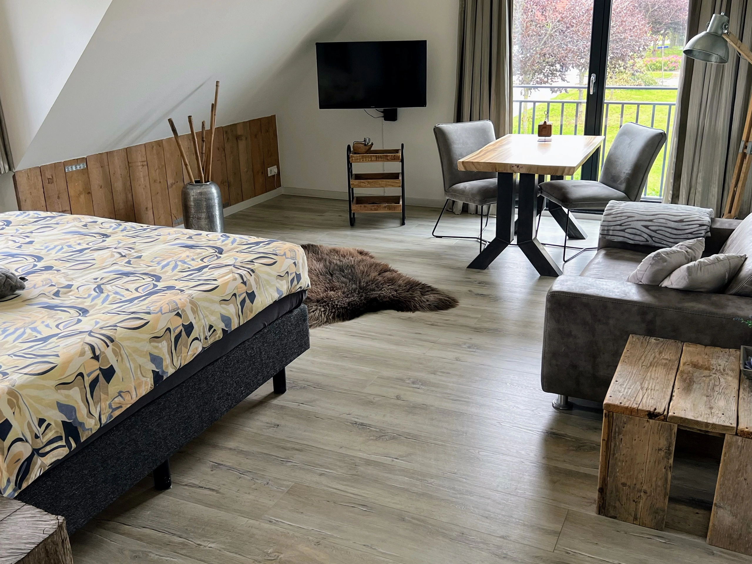 De kamer is voorzien van 1 tweepersoons boxspringbed en een zitje met smart-tv. De badkamer heeft een douche en toilet.