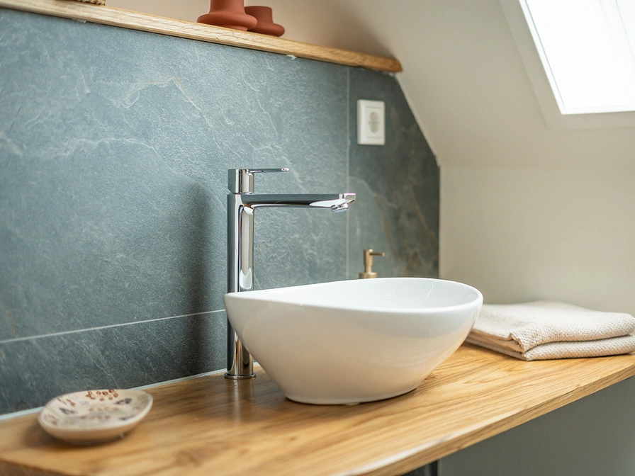 Deze ruime tweepersoonskamer op de eerste verdieping is compleet en stijlvol ingericht. De kamer heeft een tweepersoons bed met twee matrassen en eenpersoons dekbedden en een zitje. De moderne badkamer is voorzien van een regendouche, ligbad, wastafel en toilet. De kamer heeft grote dakramen waarmee je een “terras” kunt creëren op je eigen kamer.