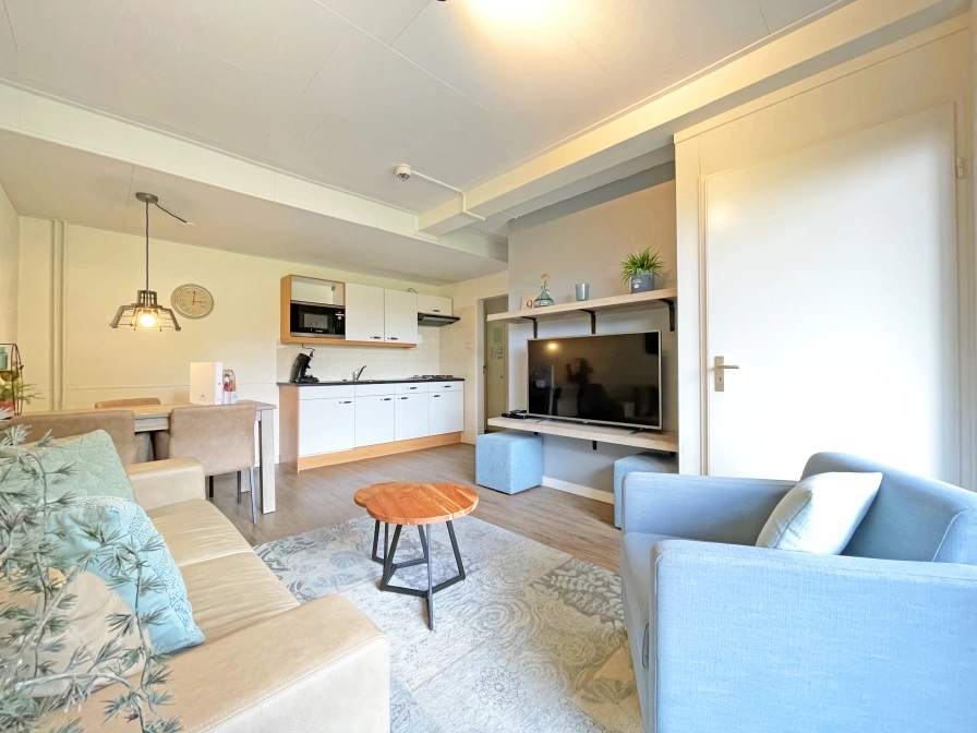 De woonkamer is voorzien van zithoek met LCD tv. Er is een eethoek. De open keuken is ingericht met koelkast, koffiezetapparaat, Nespresso, waterkoker en magnetron. Er zijn twee slaapkamers met totaal drie 1-persoons boxspringbedden. De badkamer heeft een douche, wastafel en toilet. Dit appartement ligt op de begane grond en heeft een terras met vrij uitzicht over de weilanden.