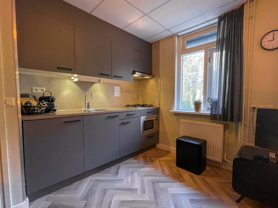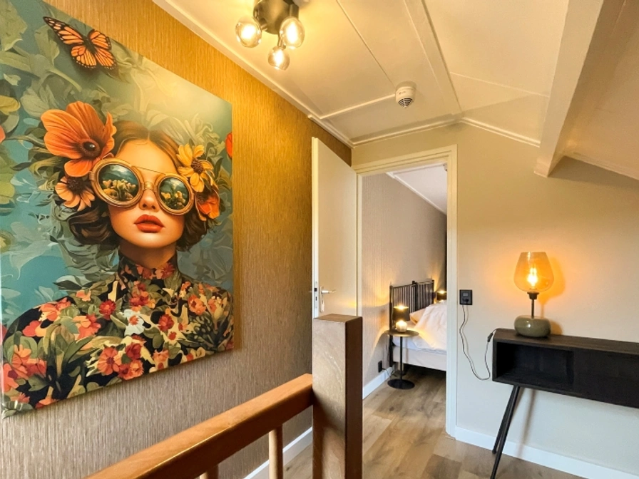De woonkamer is voorzien van zithoek met LCD tv. Er is een eethoek. De open keuken is ingericht met koelkast, koffiezetapparaat, Nespresso, waterkoker en magnetron. De badkamer heeft een douche, wastafel en toilet. Op de verdieping is een slaapkamer met 2 eenpersoons boxspringbedden en een extra wastafel. Dit appartement ligt op de 1e etage aan de boszijde en heeft een Frans balkon.