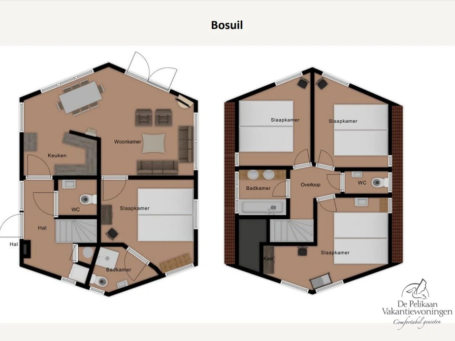 Entree, woonkamer met zithoek, houtkachel, flat screen tv, dvd-speler, radio en een eethoek. De open keuken is ingericht met vaatwasser, combimagnetron, koelkast met vriesvak, koffiezetapparaat, waterkoker en broodrooster. Er is een slaapkamer met 2 eenpersoons bedden op de begane grond. Aangrenzend ligt een badkamer met douche en wastafel. Apart toilet. Op de bovenverdieping zijn drie slaapkamers met elk 2 eenpersoons bedden. Tweede badkamer met ligbad en dubbele wastafel en toilet. De Bosuil heeft een riante tuin met terras en tuinmeubilair.