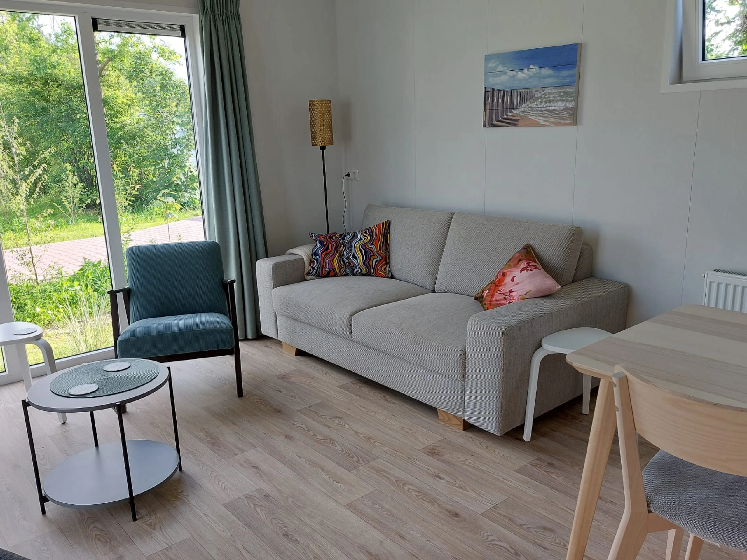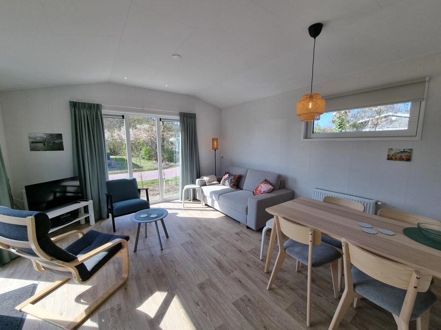 Entree, woonkamer met een bank met 2 relax stoelen en een eettafel met 4 stoelen (voor de 5e persoon is er een klapstoel aanwezig in de berging). Open keuken die van alle gemakken is voorzien. De grote slaapkamer heeft 2 aparte bedden tegen elkaar aan en de kleine slaapkamer zijn 3 aparte bedden waarvan 1 hoogslaper. De badkamer is voorzien van een inloopdouche, wastafel en toilet. Bij het chalet is een groot terras met tuinmeubilair.
