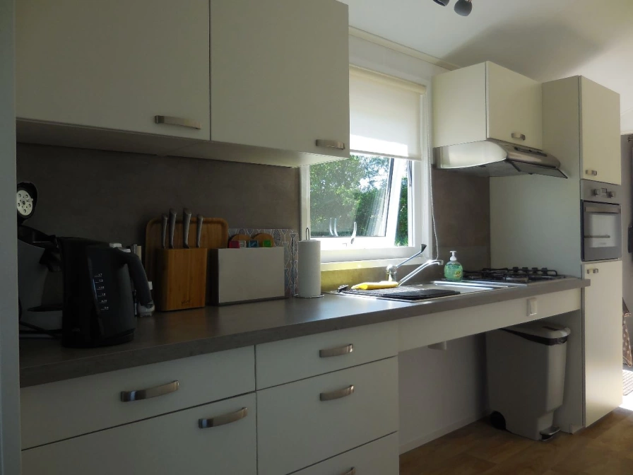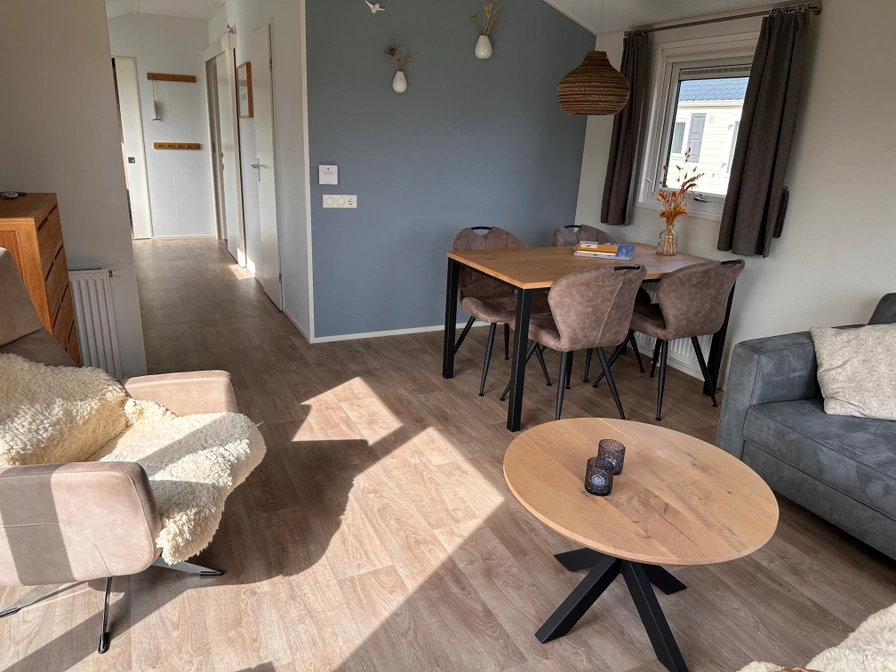 De woonkamer heeft een zithoek met TV, bluetooth radio met wifi (streaming mogelijk) en een eethoek. De open keuken is ingericht met een gedeeltelijk onderrijdbaar keukenblad, combi-oven, koelkast met vriesvak, Senseo, filter koffiezetapparaat, waterkoker en tosti-ijzer. Er zijn twee slaapkamers waarvan één met 2 (aaneengesloten) eenpersoons bedden met elektrisch verstelbare lattenbodems (geen hoog/laagbed) en een tv. De andere slaapkamer heeft 2 eenpersoons boxspringbedden van 80 cm breed en 200 cm lang (let op: deze slaapkamer is niet rolstoeltoegankelijk). De badkamer is voorzien van douche met opklapbare douchekruk, onderrijdbare wastafel en toilet met opklapbare beugels. Het chalet heeft een ruim terras met tuinmeubilair en extra picknicktafel. Er zijn 2 parasols beschikbaar.
