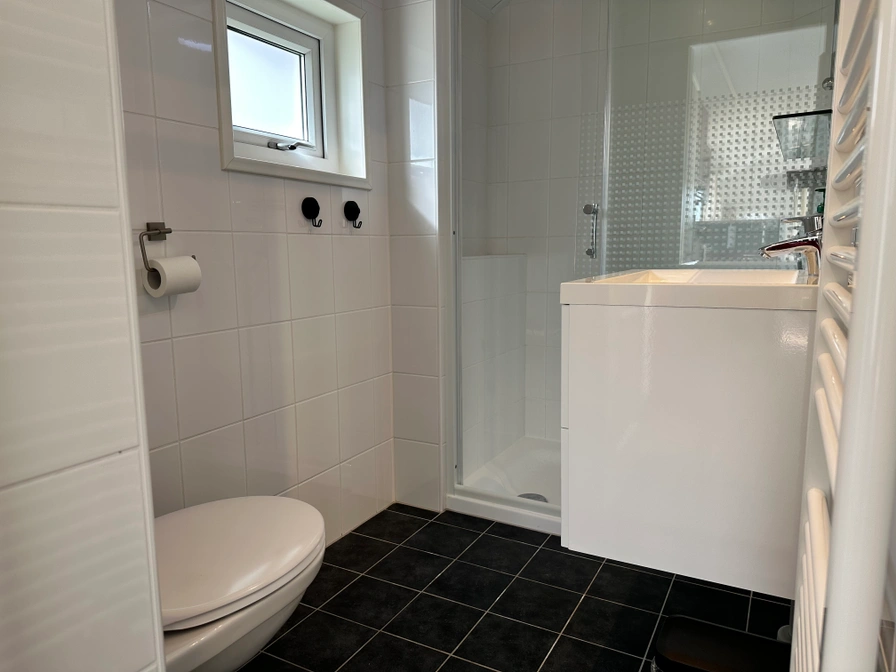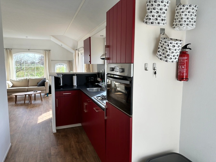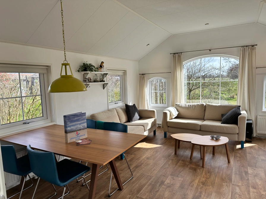 Entree. De woonkamer met open keuken heeft een zithoek met tv (HD ontvanger via kabel, Chromecast met Google TV (4K) en dvd/cd speler. Er is een eethoek met vier stoelen. De keuken is ingericht met een vaatwasser, combi oven, koelkast met vriesvak, filter koffiezetapparaat, Nespresso koffiezetapparaat, melkopschuimer, waterkoker, sinaasappelpers en een tosti apparaat. Er zijn twee slaapkamers waarvan één met 2-persoonsbed (1.60 x 2.00) met 2 matrassen (80 x 200), kussens en 2 éénpersoonsdekbedden. De andere slaapkamer heeft 2 éénpersoons bedden (80 x 2.00), kussens en 2 éénpersoonsdekbedden. In beide slaapkamers is een kledingkast aanwezig. De badkamer is voorzien van een douche, wastafel en toilet. Het chalet heeft een ruim terras met tuinmeubilair (4 stoelen en een tafel) en er is een parasol beschikbaar.