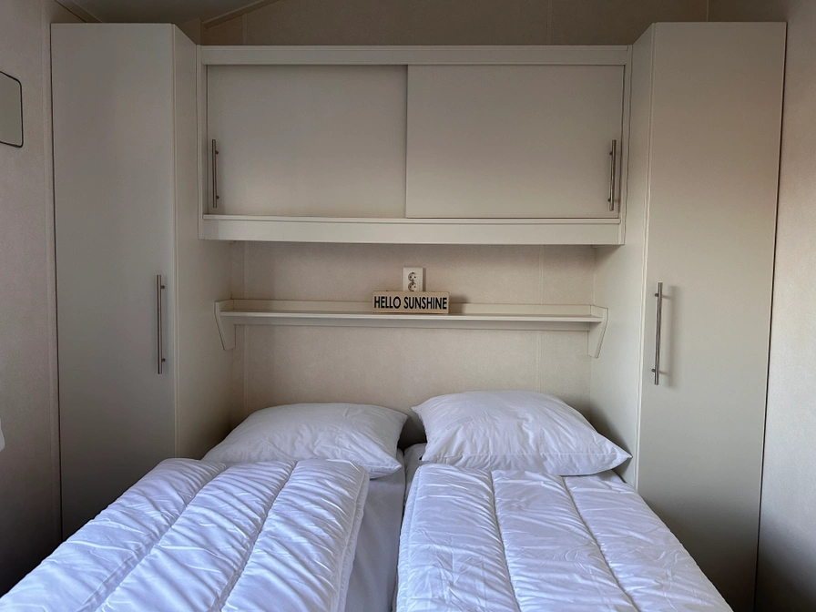 Dit chalet heeft een woonkamer met een fijne zithoek en tv. Er is een eethoek met vier stoelen. De open keuken is ingericht met een oven, gaskookplaat en koelkast met vriesvak. Er zijn twee slaapkamers waarvan 1 met een 2 persoonsbed (2 eenpersoons boxsprings 70x200) en 1 met 2 eenpersoonsbedden (80x200). Kussens en 1-persoonsdekbedden zijn aanwezig. De badkamer is voorzien van douche en toilet. Het chalet heeft een ruime, beschutte tuin met terras en tuinmeubilair. Er is een parasol beschikbaar.