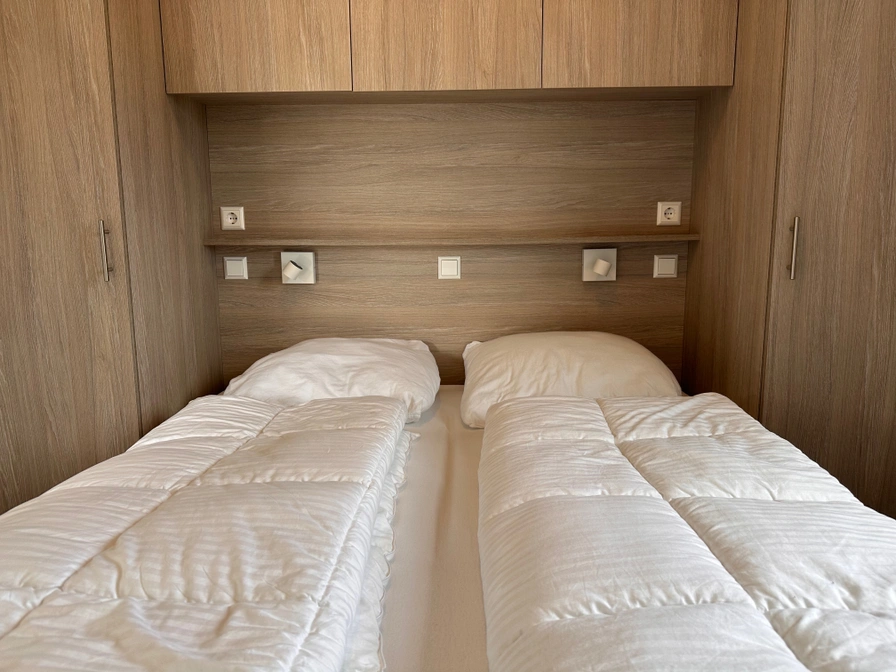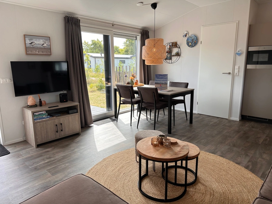 Dit chalet is zeer comfortabel en gezellig ingericht. De woonkamer heeft een zithoek en Smart TV en een schuifpui naar het terras. De openkeuken heeft een vaatwasser, gaskookplaat, combi-magnetron en koelkast met vriesvak, er is een Nespresso koffiemachine en waterkoker aanwezig.. Er zijn twee slaapkamers. Slaapkamer 1 heeft een tweepersoonsbed (140 x 200 cm), matras is tweepersoons, de dekbedden zijn éénpersoons. Slaapkamer 2 heeft twee één-persoons bedden voorzien van 1-persoons dekbedden. Alle ramen en buitendeuren zijn voorzien van horren. Via de schuifpui kom je op het terras.