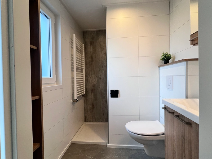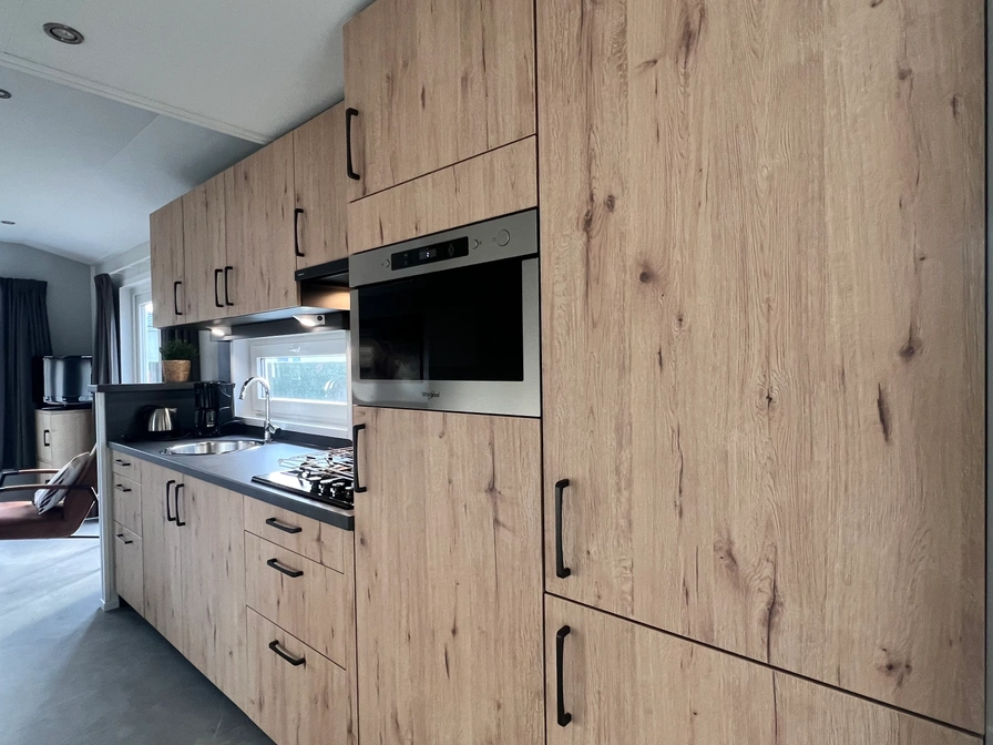In de woonkamer van staat een bank, een flatscreen tv en een eethoek. De open keuken is ingericht met een 4-pits gaskookplaat, koelkast met vriesvak, magnetron, filter koffiezetapparaat en waterkoker. Er zijn twee slaapkamers waarvan één met een tweepersoons boxspringbed (2 matrassen van 80x200). In de andere slaapkamer staat een éénpersoons bed en een stapelbed waarvan beide bedden opklapbaar zijn. De ruime badkamer is uitgerust met douche, wastafel en toilet. Het chalet heeft openslaande deuren naar de tuin met tuinmeubilair en een oplaadpunt voor de fiets.