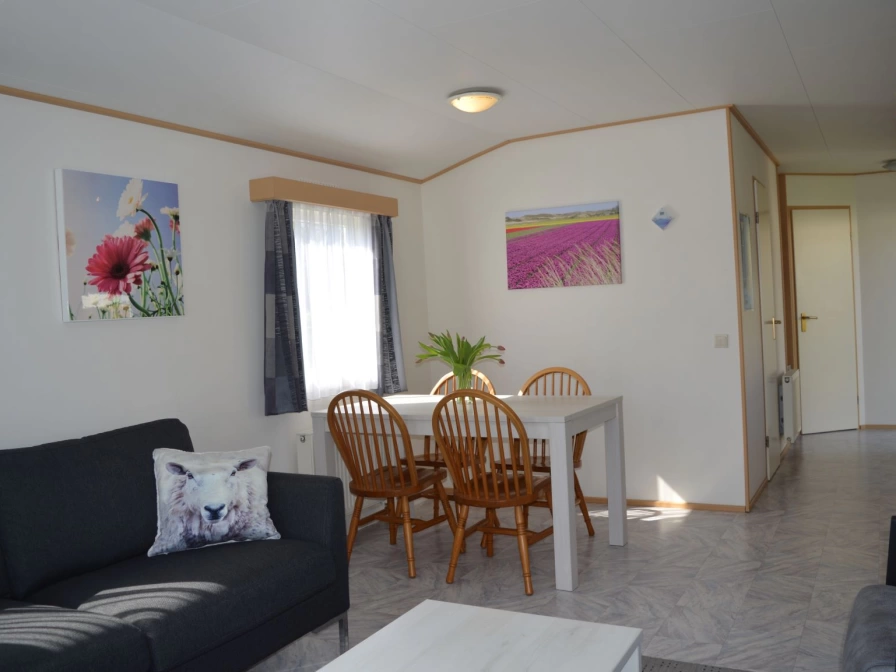 De woonkamer heeft een zithoek met tv en een eethoek. De open keuken is ingericht met een vaatwasser, koelkast met vriesvak, magnetron, waterkoker en koffiezetapparaat. Er zijn twee slaapkamers, waarvan één met tweepersoons bed. In de andere slaapkamer staan 2 eenpersoons bedden. De badkamer heeft een douche en toilet. Het chalet heeft een tuin. Tuinmeubilair is aanwezig.