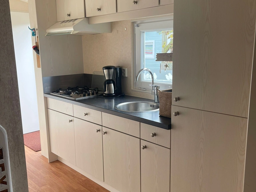 Woonkamer met een bank, losse relax stoel en een eethoek. Open keuken met oven, koelkast, vriezer en een volledige inventaris. Er zijn over 2 slaapkamers, een grote slaapkamer (met een 2-persoons bed (160 x 200 cm) met eenpersoons dekbedden) en een kleine slaapkamer. De bedden van de kleine slaapkamer zijn 70cm breed en dus niet geschikt voor volwassenen. De badkamer van het chalet is ruim en beschikt over een toilet, wastafel en douche. Je hebt een fijne, afgeschermde tuin met een terras met tuinmeubels. Naast het chalet is er ruimte om 1 auto te parkeren.