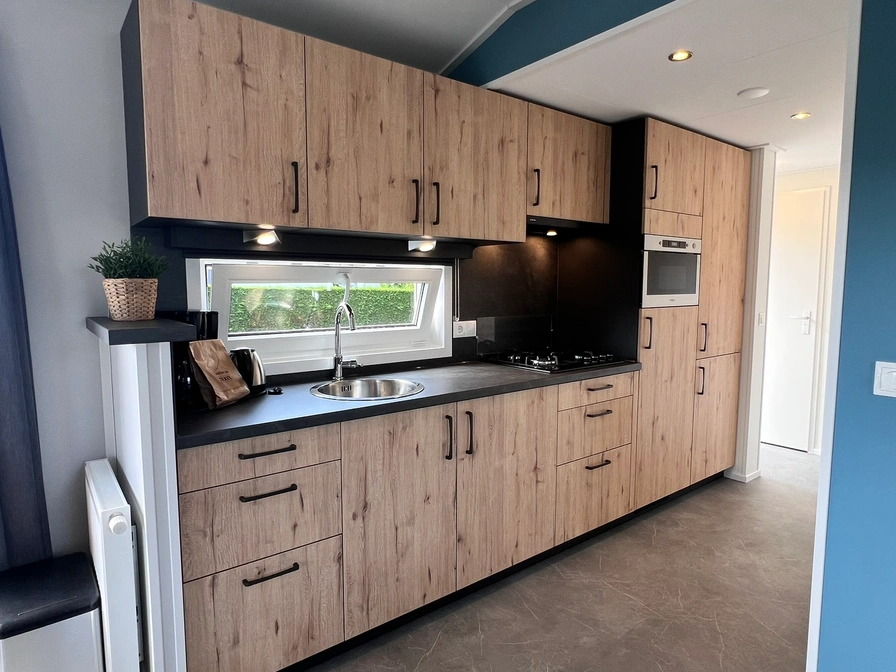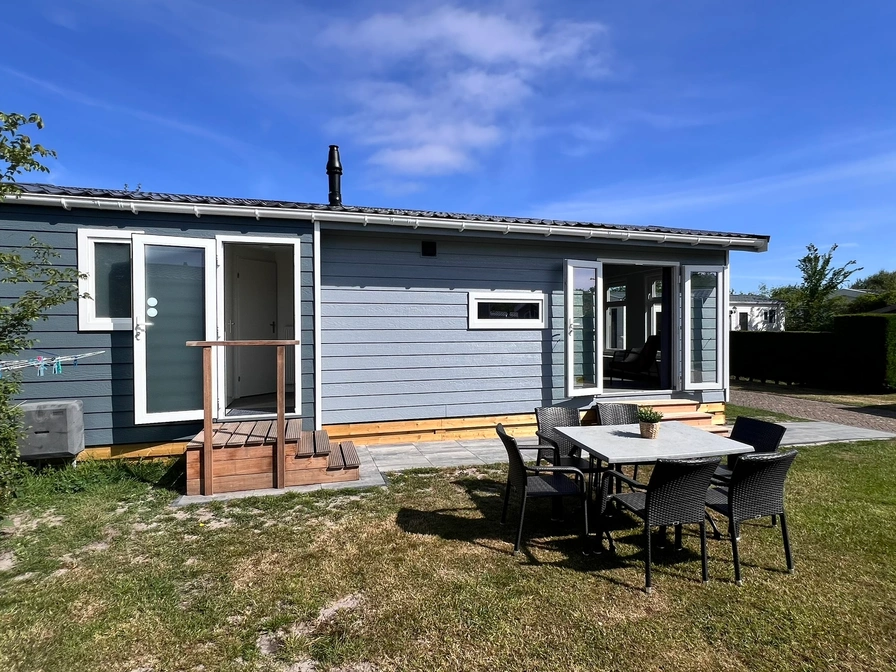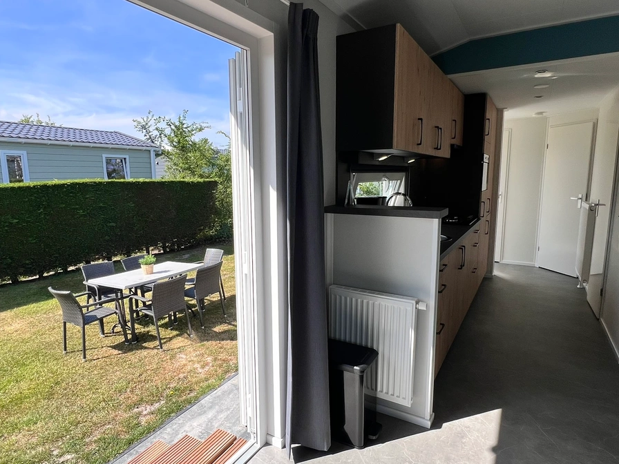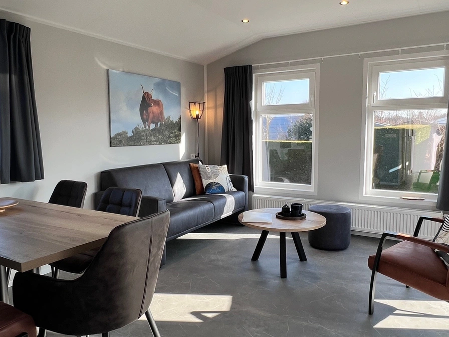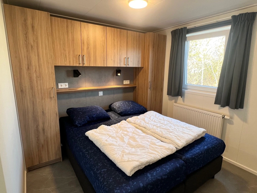 In de woonkamer van het chalet staan een bank, een flatscreen tv en een eethoek. Het chalet heeft openslaande deuren naar de tuin. De open keuken is ingericht met een 4-pits gaskookplaat, koelkast met vriesvak, magnetron, filter koffiezetapparaat en waterkoker. Er zijn twee slaapkamers waarvan één met een tweepersoons boxspringbed (2 matrassen van 80x200). In de andere slaapkamer staat een éénpersoons bed en een stapelbed waarvan beide bedden opklapbaar zijn. De ruime badkamer is uitgerust met douche, wastafel en toilet. Het chalet heeft een tuin met tuinmeubilair en een oplaadpunt voor de fiets.