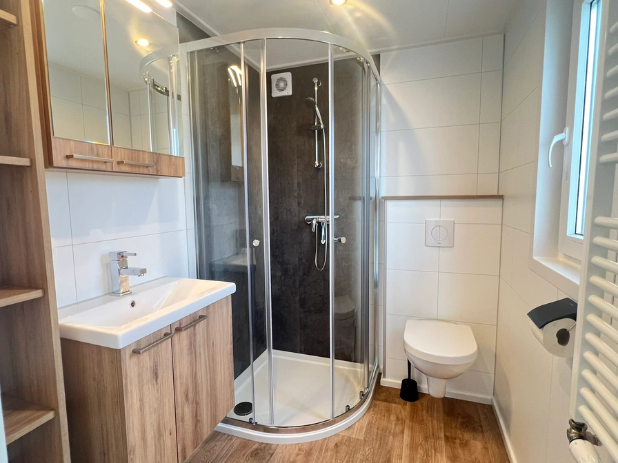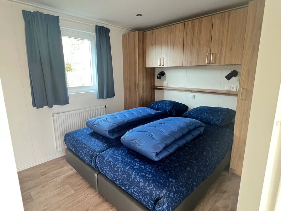 In de woonkamer van het chalet staan een bank, een flatscreen tv en een eethoek. Het chalet heeft openslaande deuren naar de tuin. De open keuken is ingericht met een 4-pits gaskookplaat, koelkast met vriesvak, magnetron, filter koffiezetapparaat en waterkoker. Er zijn twee slaapkamers waarvan één met een tweepersoons boxspringbed (2 matrassen van 80x200). In de andere slaapkamer staat een éénpersoons bed en een stapelbed waarvan beide bedden opklapbaar zijn. De ruime badkamer is uitgerust met douche, wastafel en toilet. Het chalet heeft een tuin met een schuurtje en tuinmeubilair.