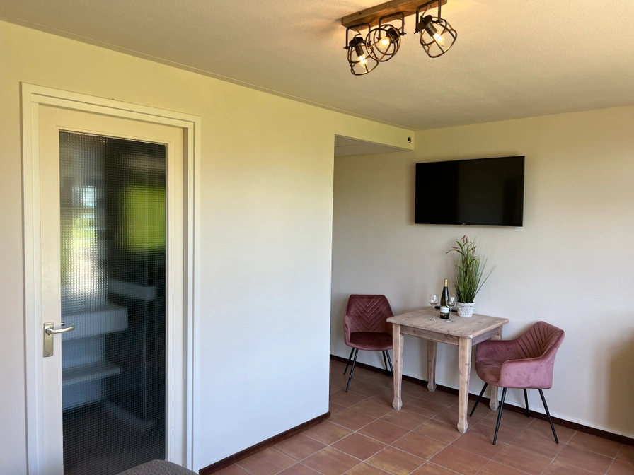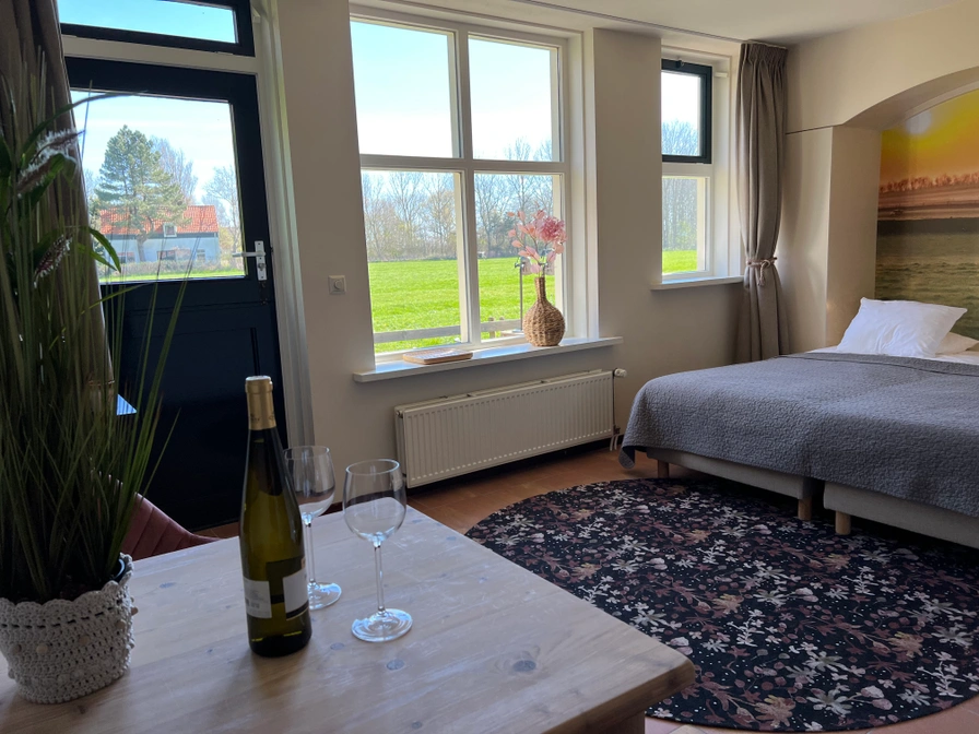 Een 2-persoons kamer op de begane grond. Buiten vind je een eigen terrasje waar je heerlijk kunt genieten. Door een praktische tussendeur kan er eventueel een koppeling tussen twee kamers gemaakt worden.