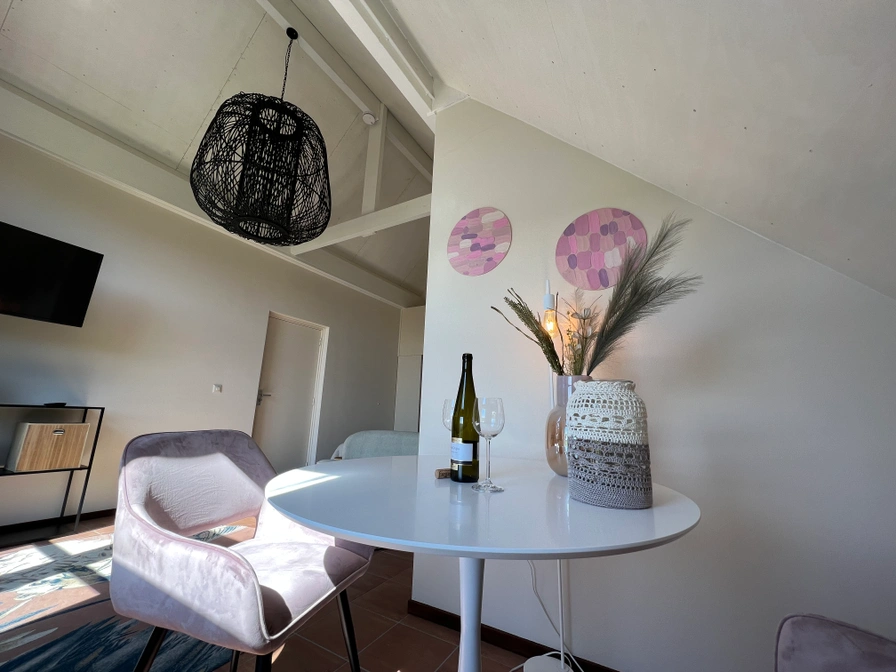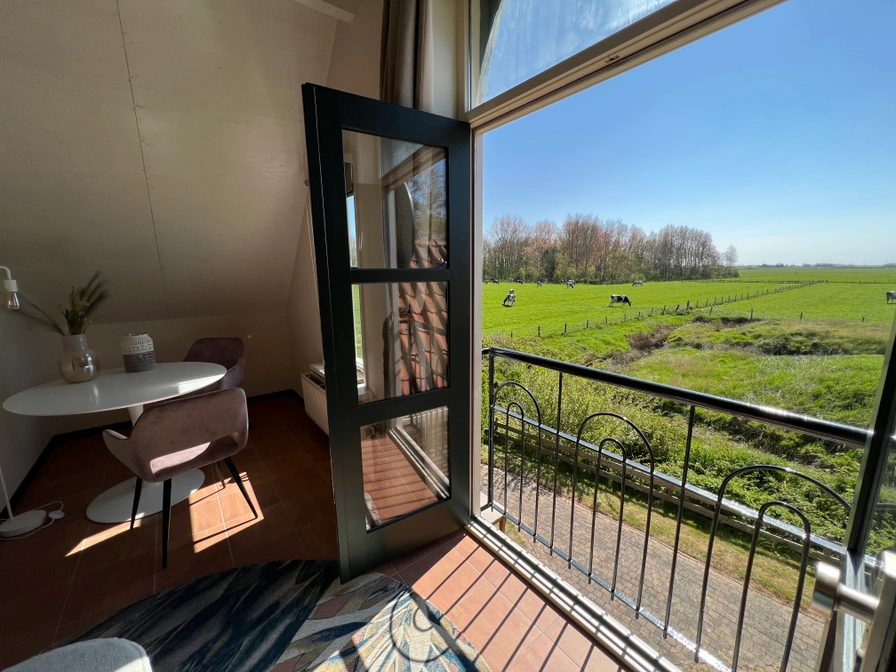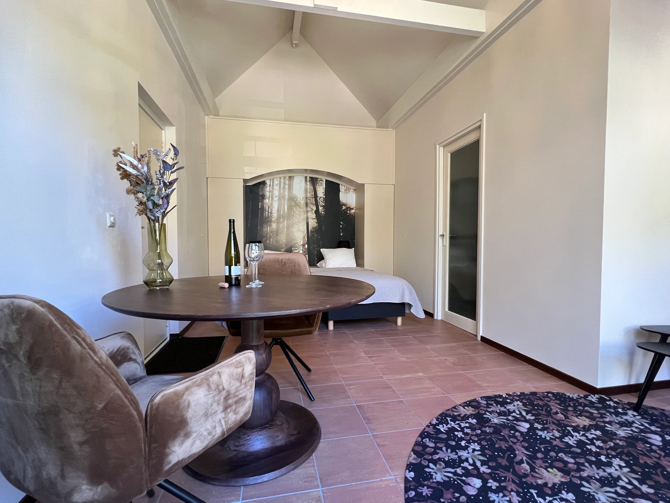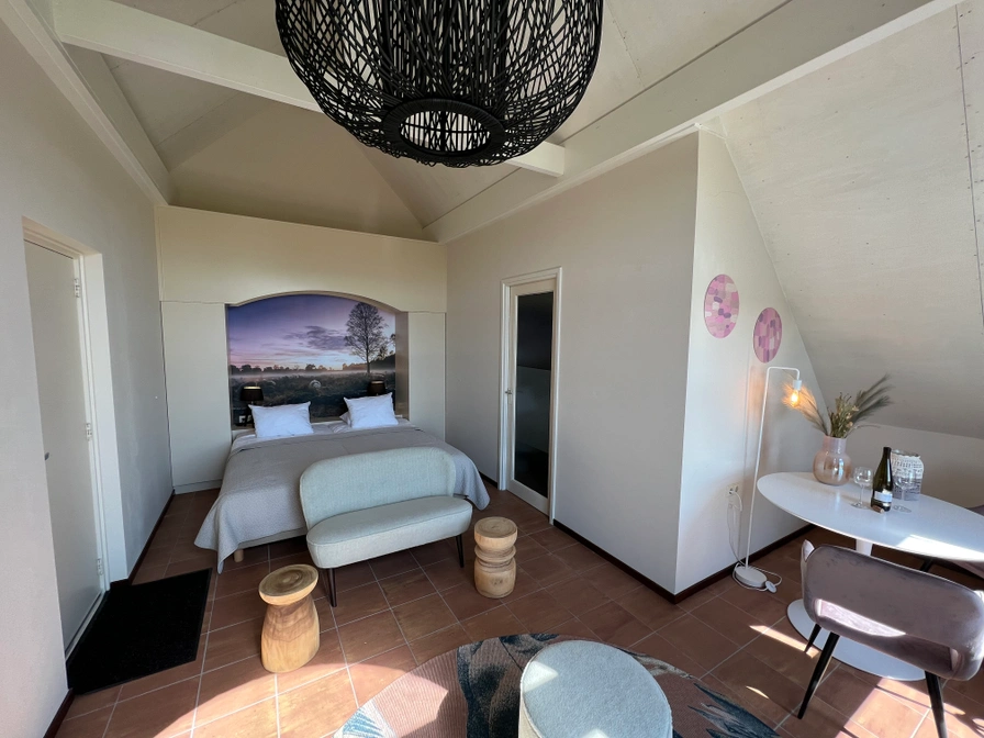 Een 2-persoons riante hoekkamer op de eerste verdieping (te bereiken via trap). In deze kamer vind je een extra hoek waar je comfortabel kunt vertoeven op de bank of twee heerlijke lounge stoelen. Sfeervolle (dimbare) verlichting. Openslaande deuren om heerlijk te kunnen genieten van de Texelse bos- en zeelucht, met uitzicht op het weiland of bos. Grote ronde tafel met comfortabele stoelen. De badkamer is voorzien van een bad en aparte douche.
