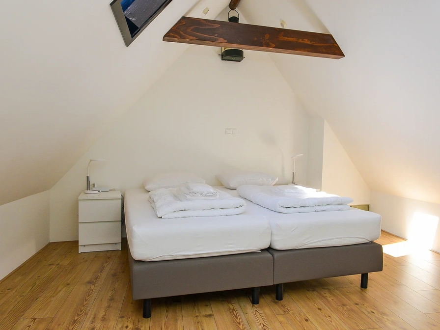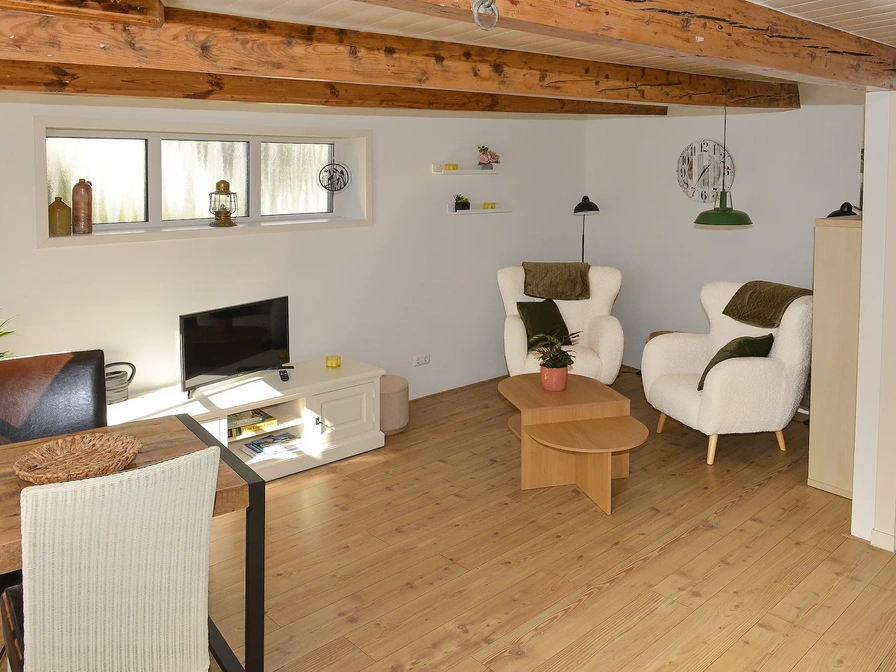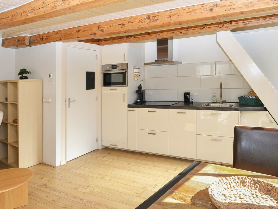 De woonkamer heeft een zithoek met tv en een eethoek. De open keuken is volledig uitgerust met een koelkast met vriesvak, magnetron, oven, vaatwasser en Senseo. De badkamer beschikt over een douche en toilet. Een smal trappetje leidt naar de bovenverdieping, waar een slaapkamer met een tweepersoonsbed is. Het huisje heeft vloerverwarming voor extra comfort.