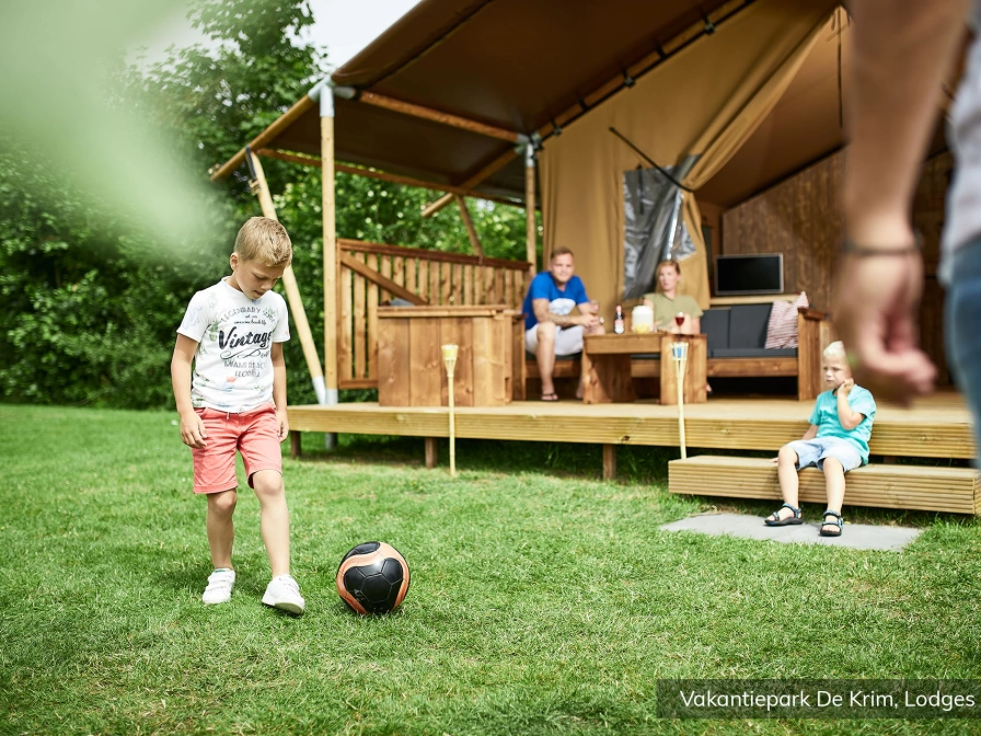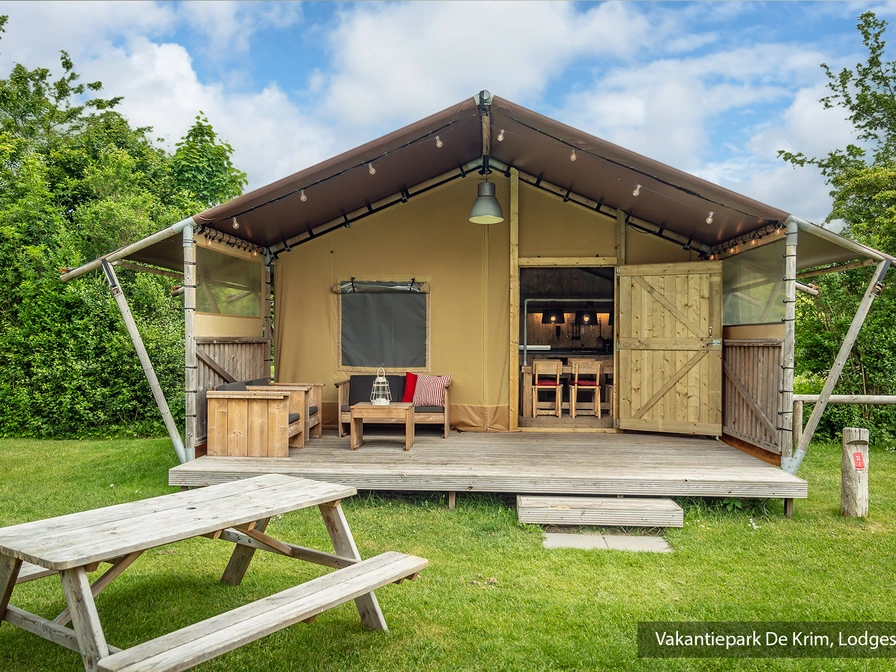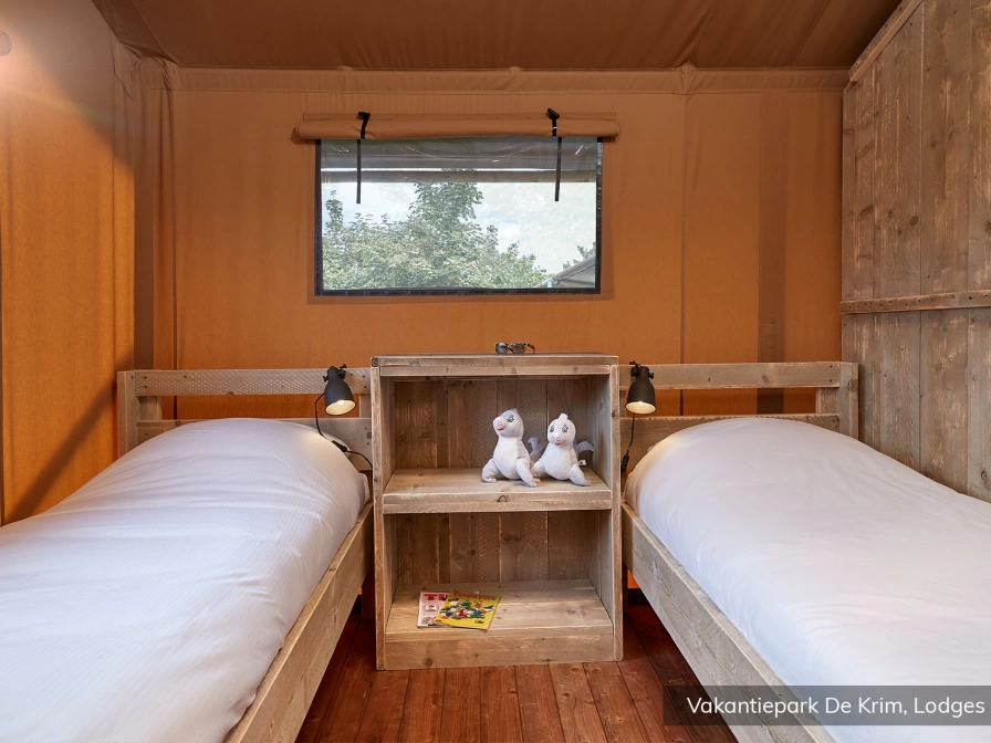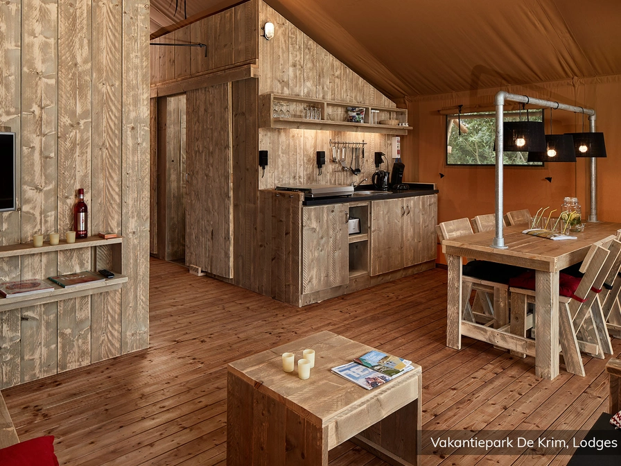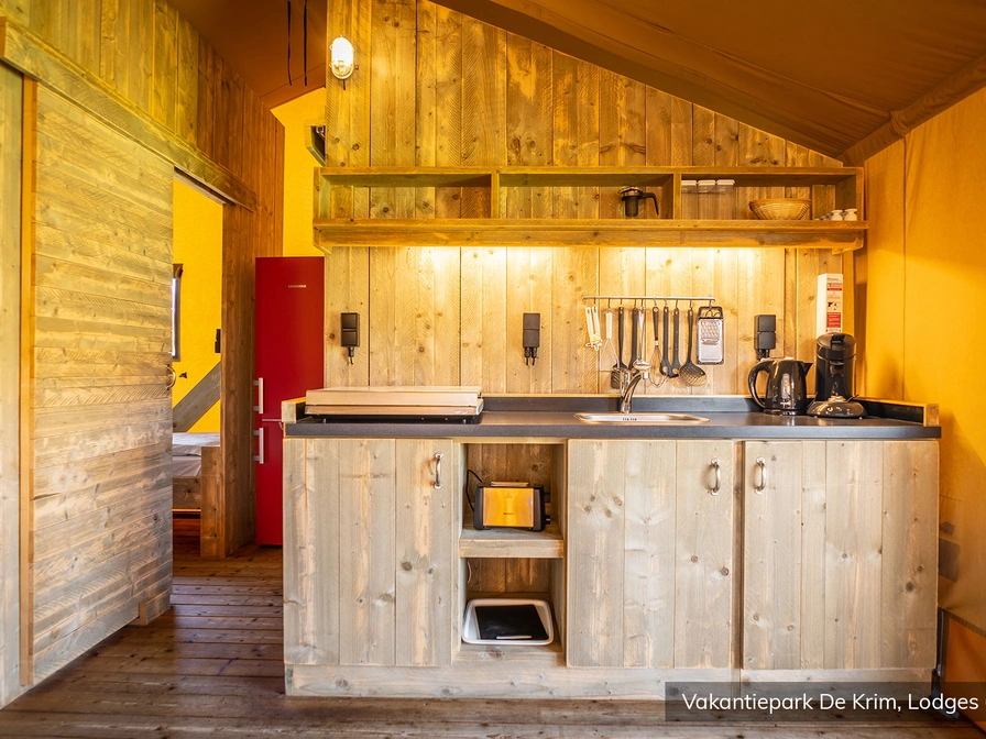 Glamping op Texel! De ruime lodges zijn geschikt voor 6 personen en compleet ingerichte glampingtenten! Echt alles is aanwezig: Een compleet ingerichte keuken, comfortabele zithoek met (petroleum) kachel, gezellige eethoek, speelruimte voor de kinderen, een eigen badkamer met douche en toilet. Je slaapt op comfortabele bedden. In deze Safari Lodge zelfs in een hemelbed! De kinderen slapen in een bedstede. Op het houten terras is het heerlijk vertoeven tot de late uurtjes. Dit is kamperen…maar dan net even anders!