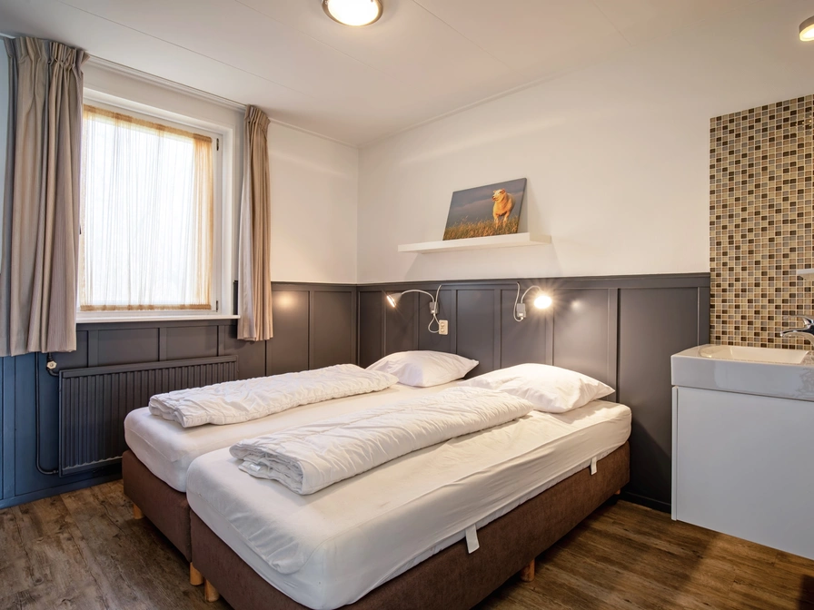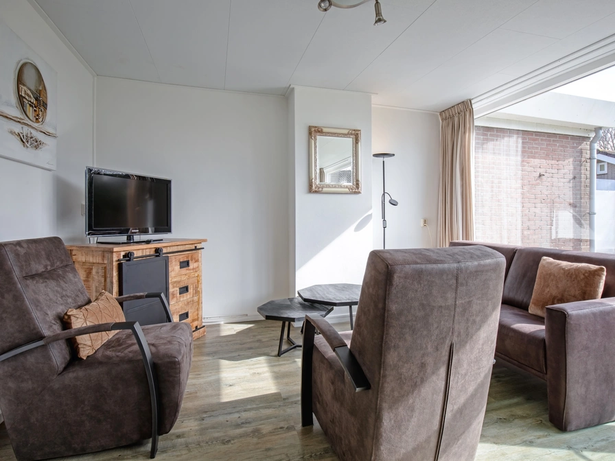 De woonkamer van deze geschakelde bungalow heeft een zithoek met tv en een eethoek. De open keuken is ingericht met koelkast met vriesvak, combimagnetron en vaatwasser. Er zijn twee slaapkamers met elk twee eenpersoons bedden. De badkamer heeft een douche, het toilet is apart. Deze bungalow heeft een tuin met terras. Tuinmeubilair is aanwezig.