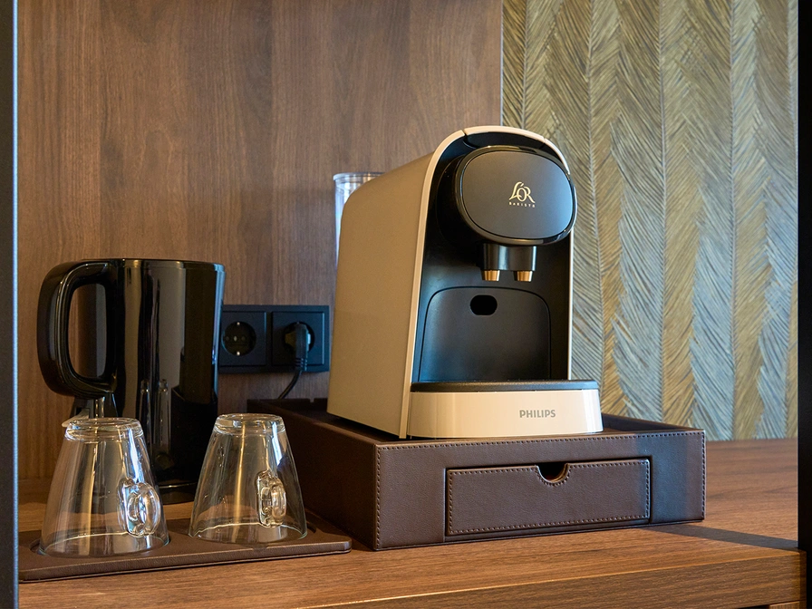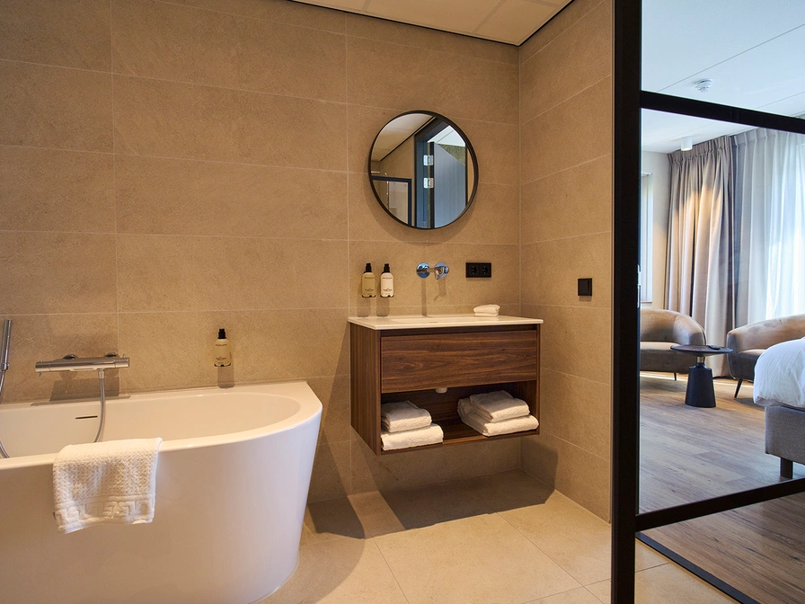 Deze ruime suite heeft een comfortabel tweepersoons boxpringbed, een fijne zithoek met smart tv en een kledingkast met grote spiegel. De riante badkamer beschikt over een ligbad, aparte inloopdouche met regendouche, wastafel en toilet. Informatie over het eiland ligt klaar in je kamer. Je beschikt over eigen koffie- en theefaciliteiten waaronder een waterkoker en een koffiecup machine. Je kamer is voorzien van wifi, verduisterende gordijnen en airconditioning. In de badkamer staan producten van het merk Marie-Stella Maris Body Care voor je klaar.