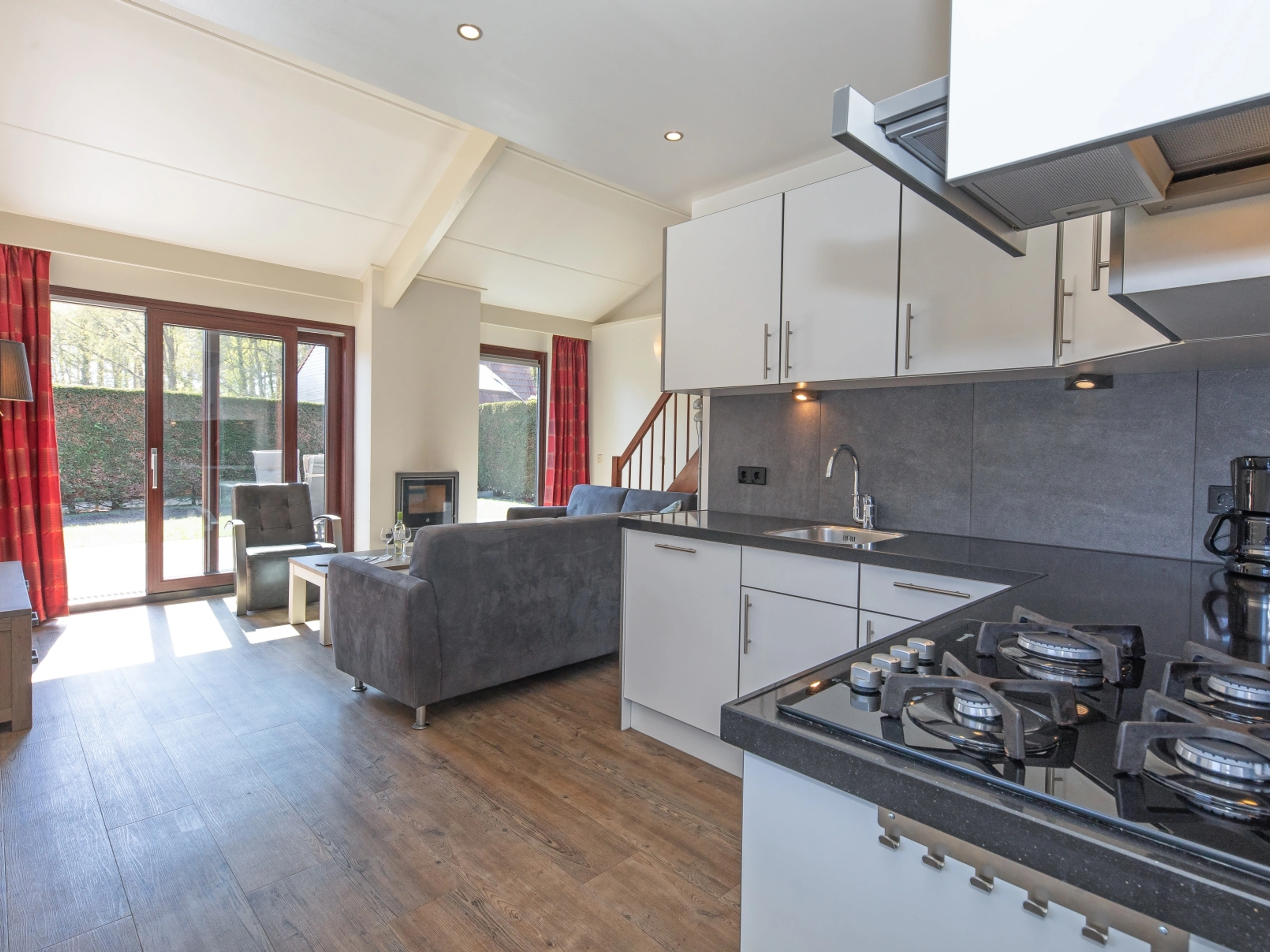 De open keuken van deze vrijstaande bungalow is ingericht met vaatwasser, magnetron, oven en broodrooster. De woonkamer heeft een zithoek met open haard, tv, radio/cd-speler en dvd-speler. Tevens is er een eethoek. De badkamer heeft een douche. Er is een apart toilet. Boven zijn twee slaapkamers met elk 2 eenpersoons bedden. Rondom dit vakantiehuis ligt een tuin. Er is een terras met tuinmeubilair.
