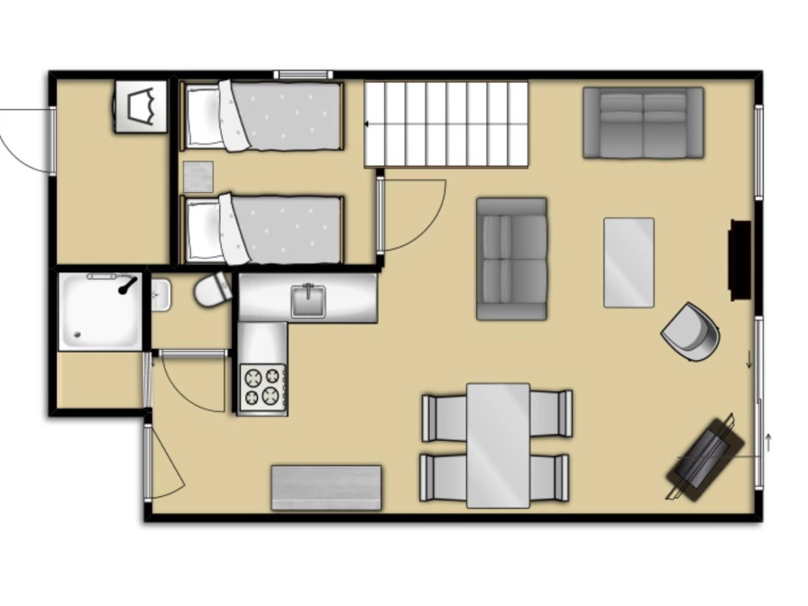 De open keuken van dit halfvrijstaande vakantiehuis is ingericht met vaatwasser en magnetron. Tevens is er een eethoek. De woonkamer heeft een zithoek met open haard, tv en radio/cd-speler. Op de begane grond is een slaapkamer met 2 eenpersoons bedden. De badkamer heeft een douche. Het toilet is apart. In de berging staat een wasmachine. Op de bovenverdieping zijn twee slaapkamers met elk 2 eenpersoons bedden. Dit vakantiehuis heeft een tuin met terras. Tuinmeubilair is aanwezig.