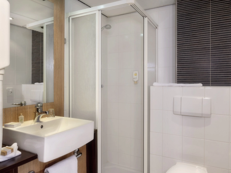 De knusse eenpersoonskamer heeft een eenpersoons boxspringbed (120x200) en een tv. Een koelkast en Nespresso zijn aanwezig. De badkamer heeft een douche, wastafel en toilet.