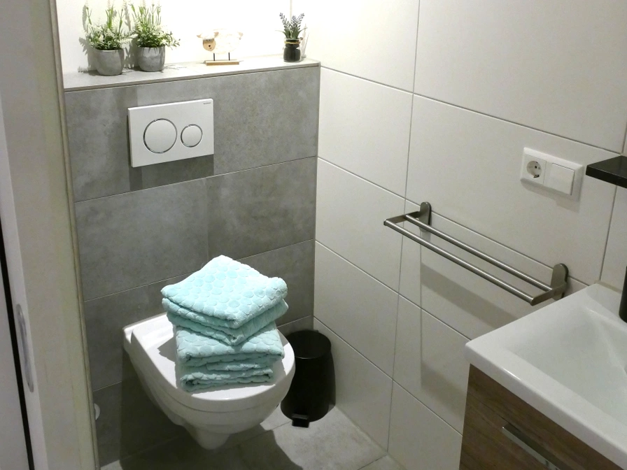 Bij de entree kom je direct in het zitgedeelte + keukenblok. In dezelfde ruimte zie je een tweepersoonsbed. Vandaar uit kun je middels een schuifdeur de kleine badkamer betreden. Deze is voorzien van douche, toilet en badkamermeubel. Televisie is ook aanwezig.