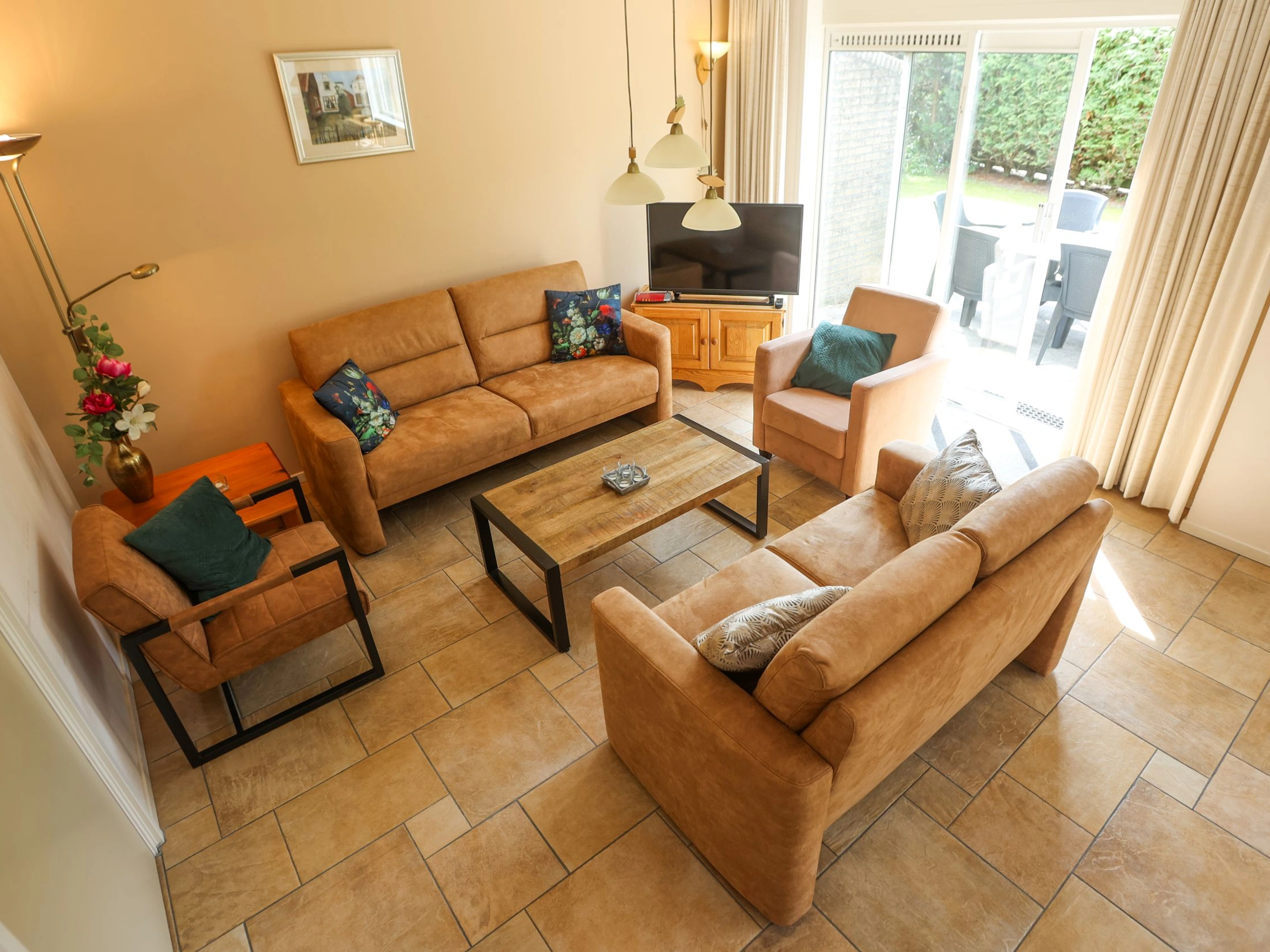 De woonkamer van dit vrijstaande vakantiehuis heeft een zithoek, tv, radio/cd-speler en een eethoek. De open keuken is ingericht met een gaskookplaat, koelkast, combi-oven, vaatwasser, broodrooster, citruspers, waterkoker en koffiezetapparaat. Er is een slaapkamer met tweepersoons boxspringbed (matrasmaat 2x 90 x 200). Aangrenzend is een badkamer met regendouche, wastafel en toilet met slowdown-system. In de berging staat een wasmachine. Op de bovenverdieping zijn twee slaapkamers met elk twee boxspringbed (90 x 200). Er is een tweede badkamer met bad, regendouche, wastafel en toilet voorzien van slowdown-system. Dit vakantiehuis heeft een tuin met een royaal terras op het zuiden. Tuinmeubilair is aanwezig.