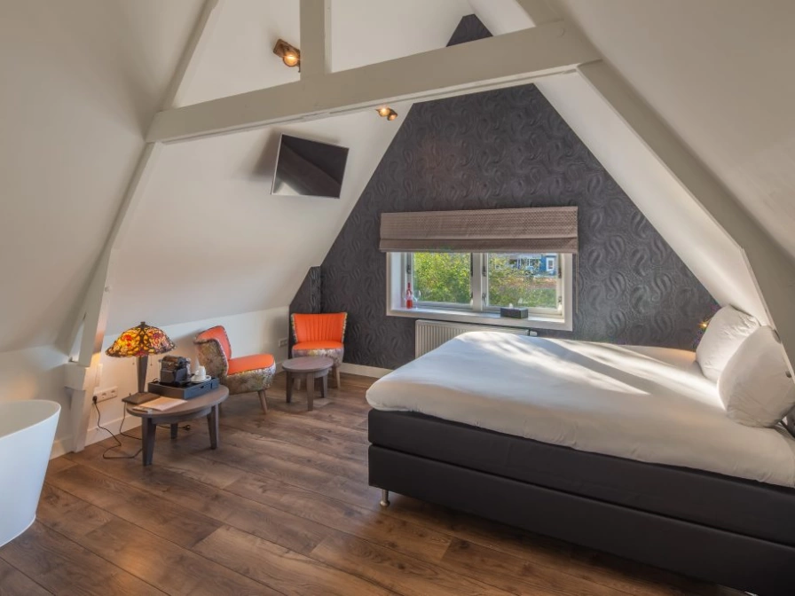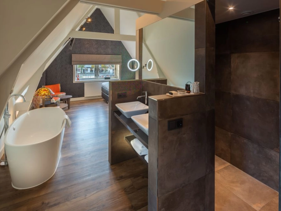 De luxe kamer ligt aan de zijkant van het pand met zicht op een gezellig plein. Aan de achterzijde heeft je kamer een riant balkon met uitzicht op het park. Er staat een comfortabel tweepersoons bed en flatscreen TV. Er is een zithoekje met een Nespressomachine voor onbeperkt koffie en thee, en uitzicht op het park en de naastgelegen kerktuin. Badkamer en suite met rainshower en dubbele waskommen. Apart toilet. De kamers zijn alleen via een trap bereikbaar.