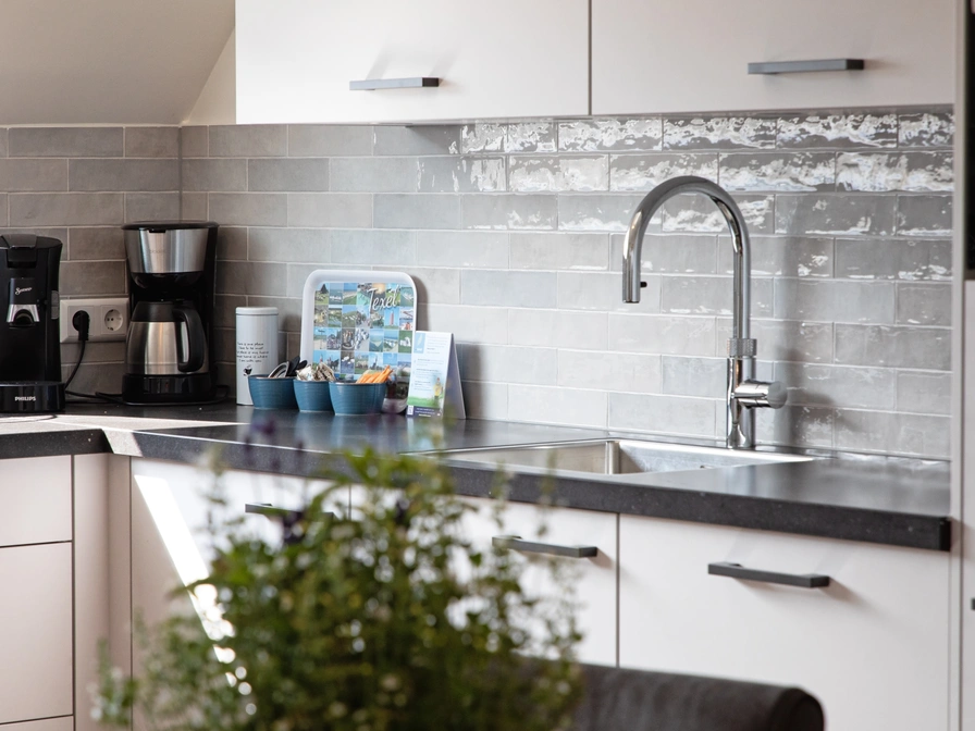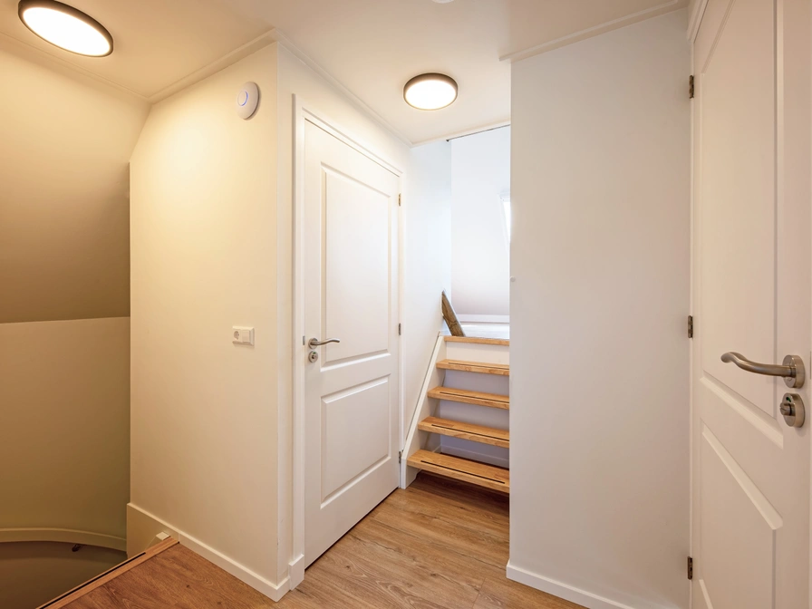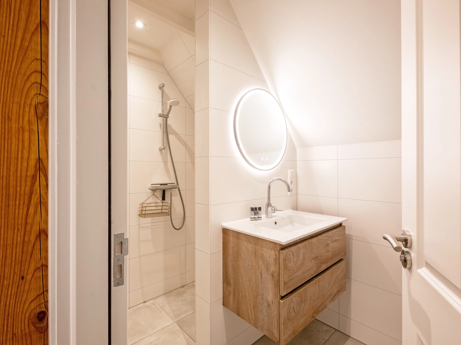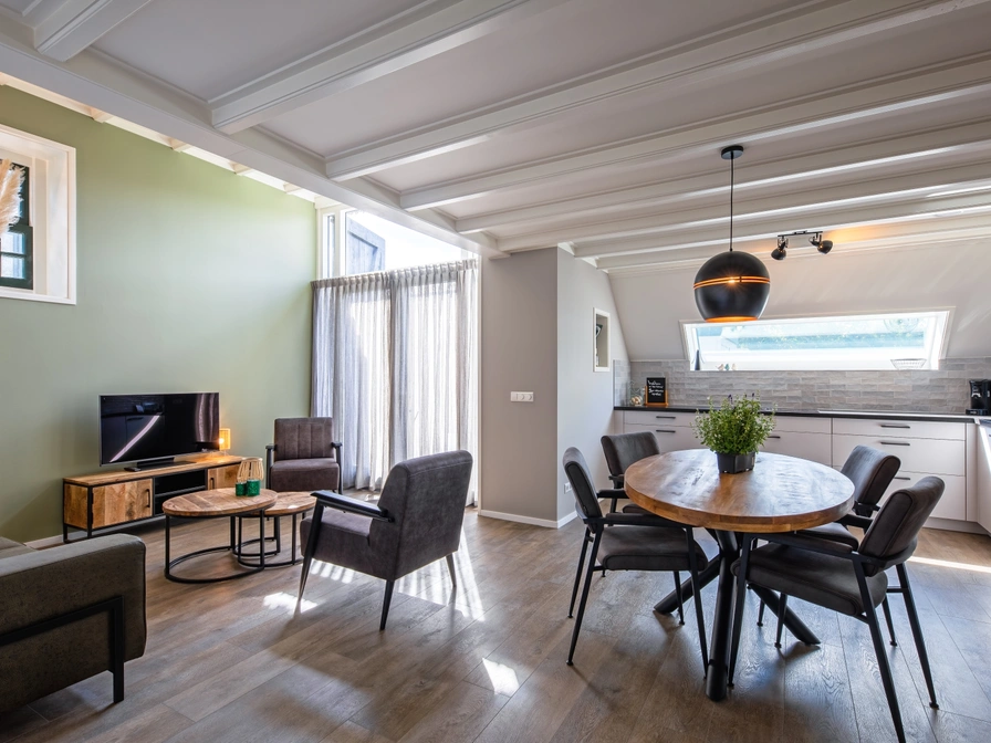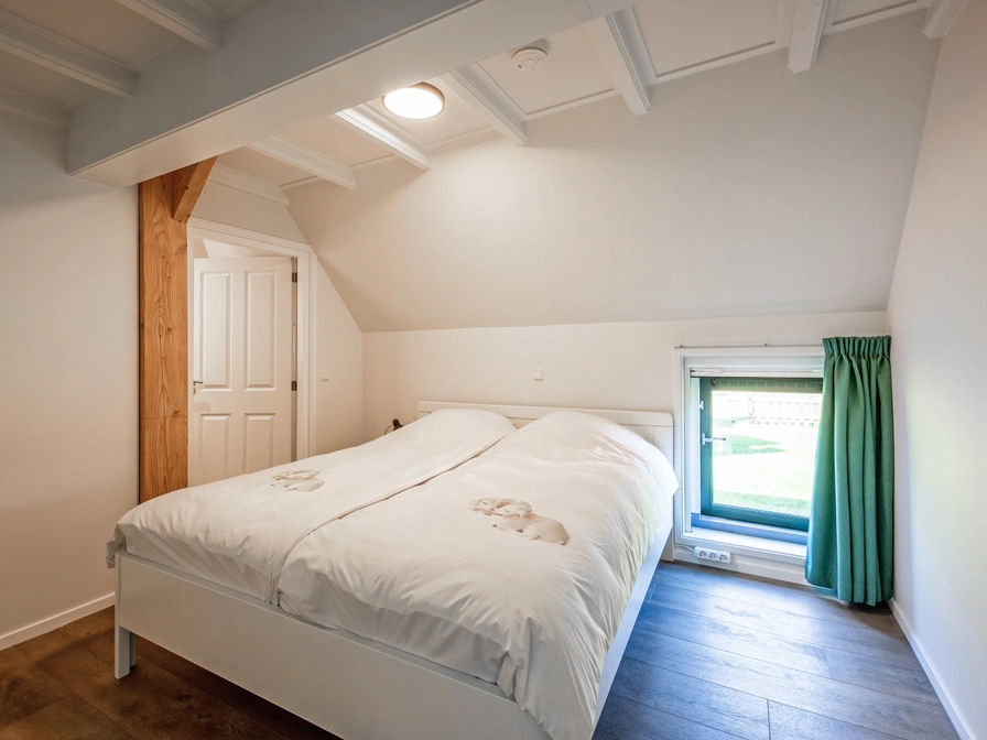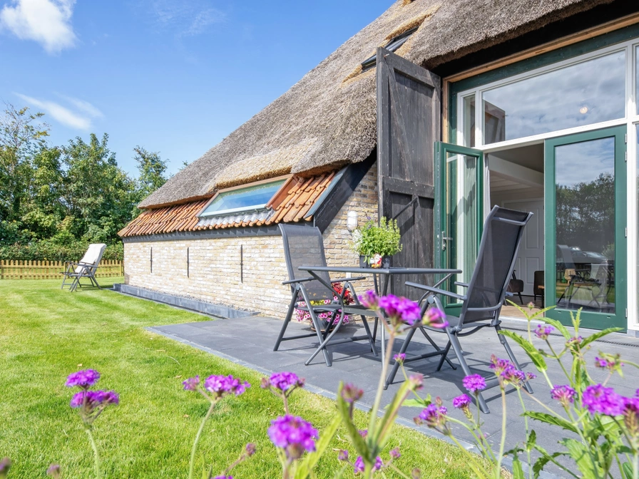 Gezellige zithoek met smart-tv, openslaande deuren naar terras en mooie ovale eettafel. De open moderne keuken heeft o.a. een afwasmachine, combimagnetron, quooker, inductiekookplaat met downdraftpannen, senseo en koffiezetapparaat. Apart toilet. Op de begane grond is een slaapkamer met een tweepersoons bed (180x200) met aansluitend een badkamer met douche en toilet. Op de bovenverdieping zijn twee slaapkamers met in elk een eenpersoons bed (90x200), een opkamer, een apart toilet en een badkamer met douche. Verhard terras bij openslaande deuren en rondom gras. Er is een schuur voor je fietsen.