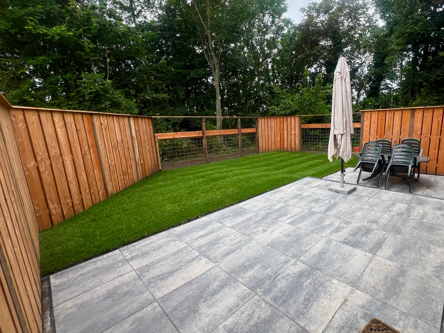 Honden aan de lijn op het erf in verband met andere dieren (eenden, katten, andere honden en paarden). Je hond mag wel los lopen in je eigen tuin, maar niet zonder toezicht. De tuin is niet bedoelt als hondenspeelplaats of hondentoilet. Jouw privé-tuin bevat ook een mooi terras met tuinmeubilair en een parasol. Vanuit het appartement stap je door de schuifpui zo de tuin in. Belangrijk om te weten is dat ons appartement inpandig is in ons eigen huis. Ook zitten er nog drie aparte B&B-kamers inpandig. Wij vragen je om die reden om een blaffende hond te voorkomen.
