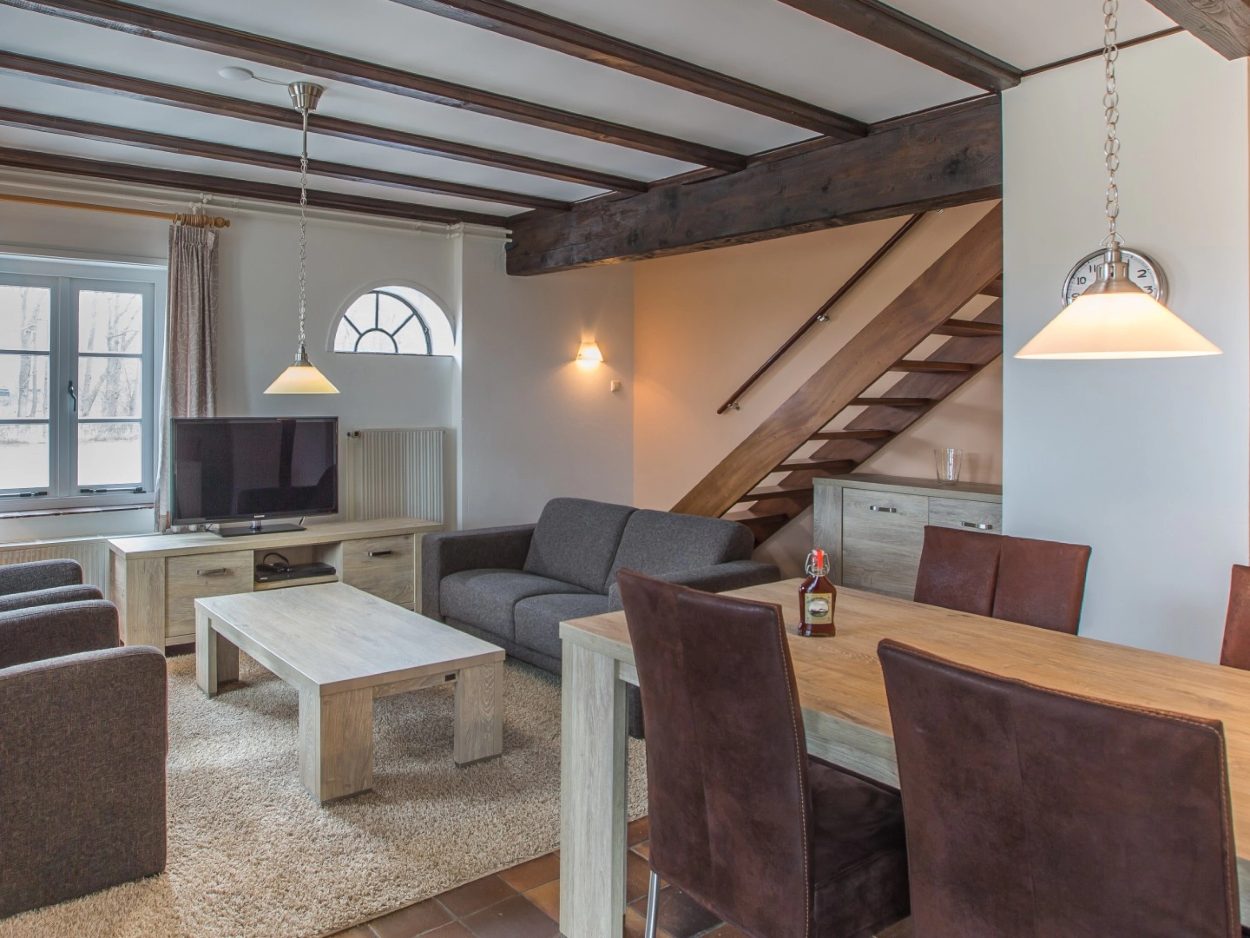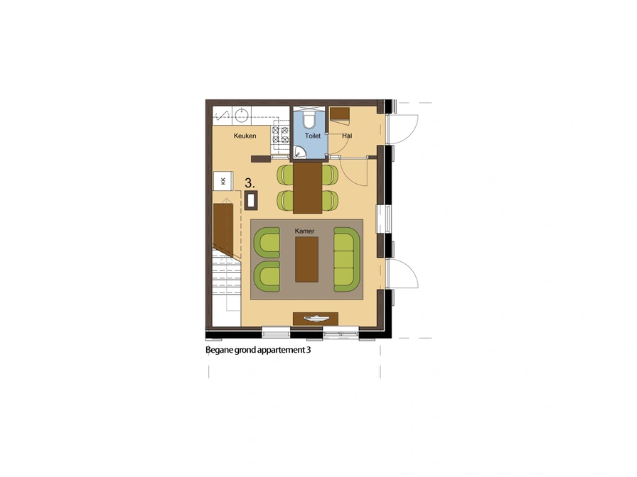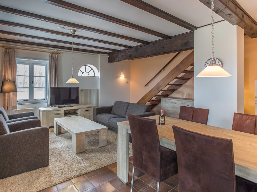 De woonkamer van appartement T-3 heeft een zithoek met flatscreen tv en een eethoek. De keuken is ingericht met een 4-pits kookplaat, koelkast met vriesvak, magnetron en vaatwasser. In de hal is een toilet aanwezig. Op de bovenverdieping zijn twee slaapkamers met elk 2 eenpersoons boxspringbedden. De badkamer heeft een douche, wastafel en toilet. Dit appartement heeft een terras met tuinmeubilair.