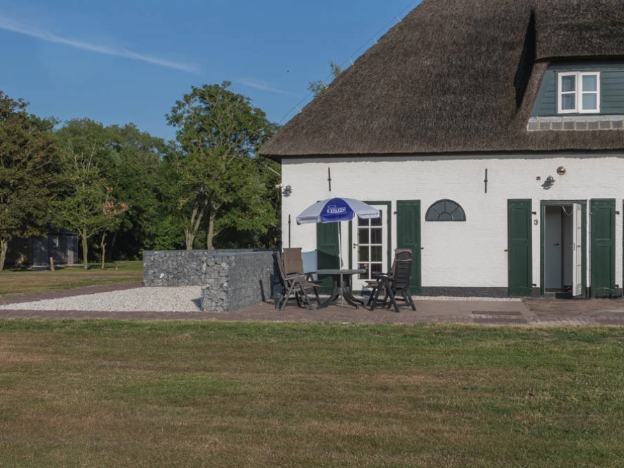 7 appartementen Authentieke, rietgedekte stolpboerderij Eigen boomgaard met zit- en speelplekken Kwartier fietsen van het strand bij de vuurtoren 2 kilometer buiten De Cocksdorp