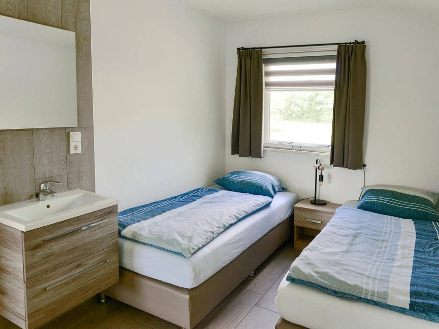 De woonkamer van deze vrijstaande bungalow, die op het erf van de boerderij staat, heeft een zithoek met tv en radio/cd-speler. Er is ook een eethoek. De open keuken is ingericht met koelkast met diepvriesvak, combimagnetron en vaatwasser. Er zijn twee slaapkamers met elk twee eenpersoonsbedden. Een van de slaapkamers heeft een wastafel. De badkamer heeft een douche. Er is een apart toilet. Deze bungalow heeft een tuin met terras. Tuinmeubilair is aanwezig.