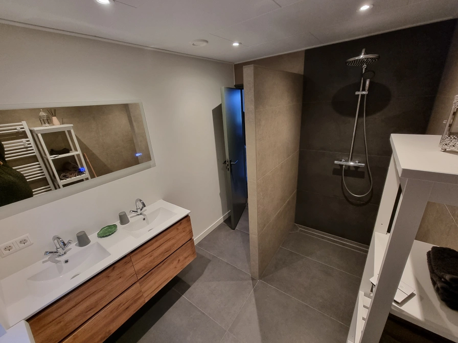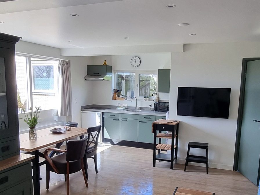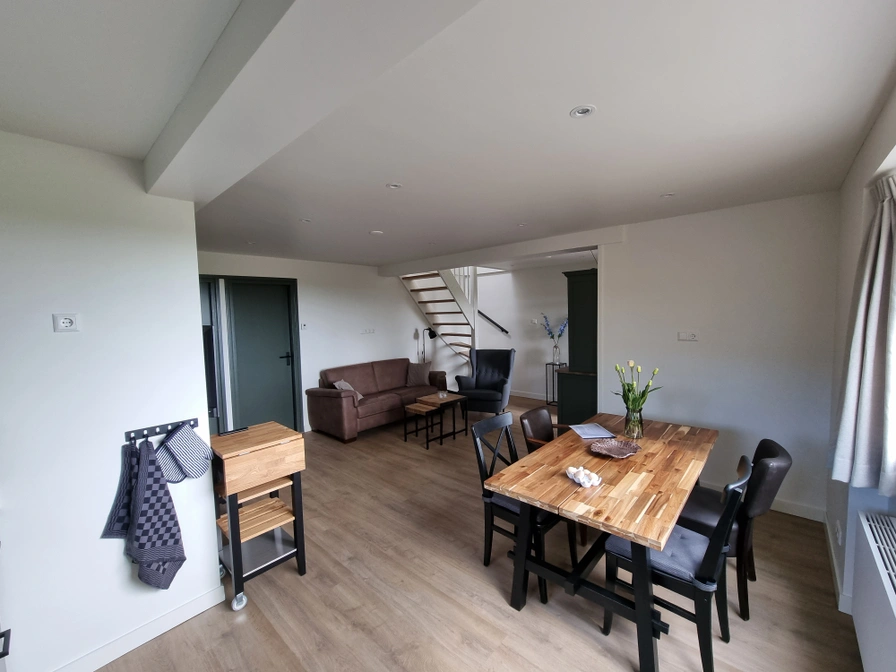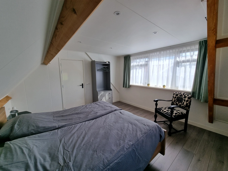Entree via hal, ruime woonkamer met open keuken. Keuken voorzien van koffiezet app en theekoker. Er is een oventje aanwezig en koelkast met vriesvak. Op de begane grond bevind zich een grote slaapkamer met 2 boxspring bedden. De toilet en badkamer bevinden zich ook op de begane vloer. De badkamer heeft een ruime douche met stortdouche en een dubbele wastafel . Op de eerste verdieping zijn 2 slaapkamers (een 1 en 2 pers slaapkamer). Dit vakantiehuis heeft een afgesloten tuin met terras. Tuinmeubilair is aanwezig.