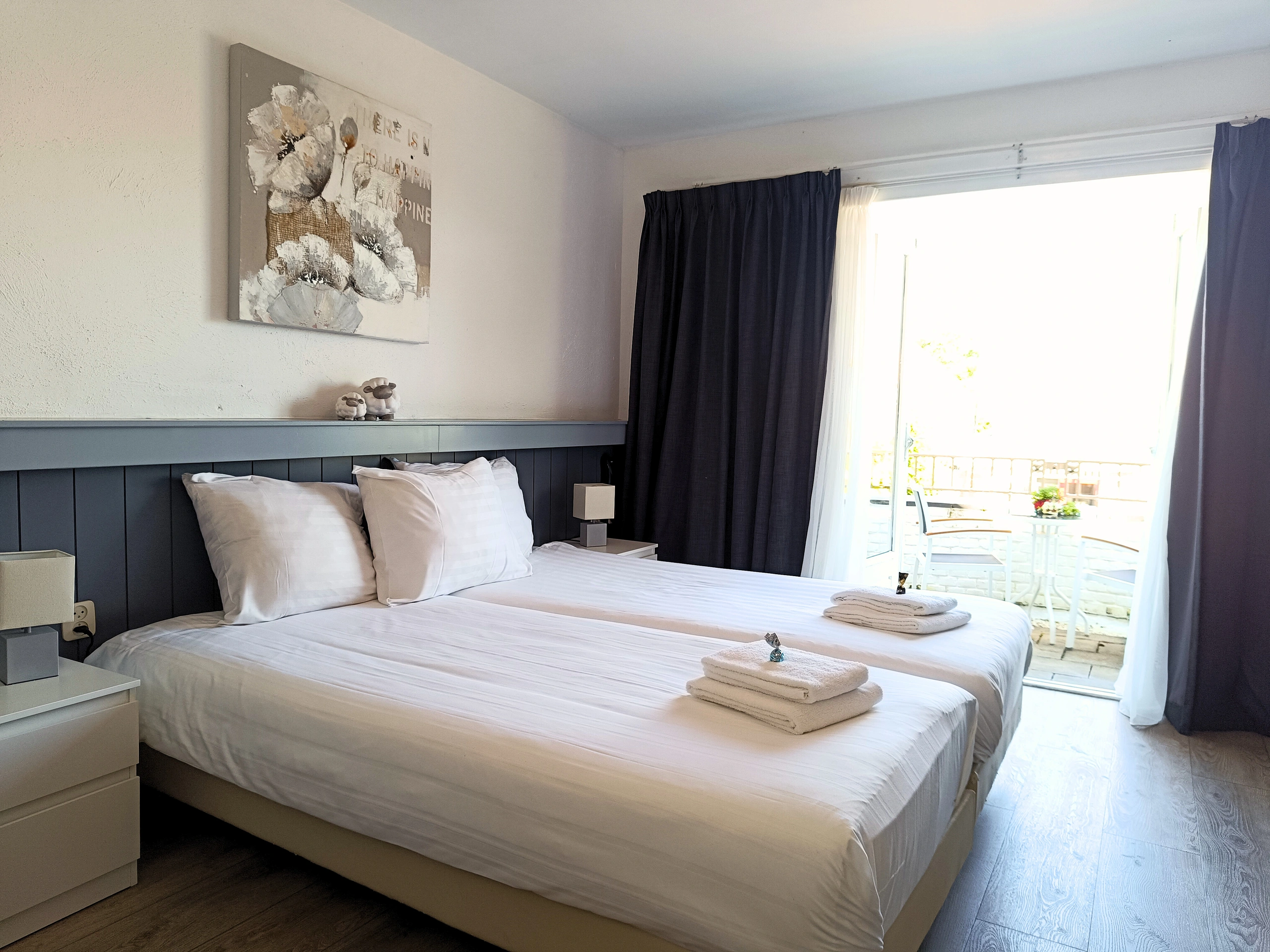 Deze tweepersoonskamer met balkon heeft 2 losse eenpersoonsbedden (extra lang), een flatscreen tv, een kledingkast, een bureau, kluisje en een zitje. Je beschikt over een eigen waterkoker en koffiezetapparaat. De kamer heeft een badkamer met douche, wastafel en toilet.