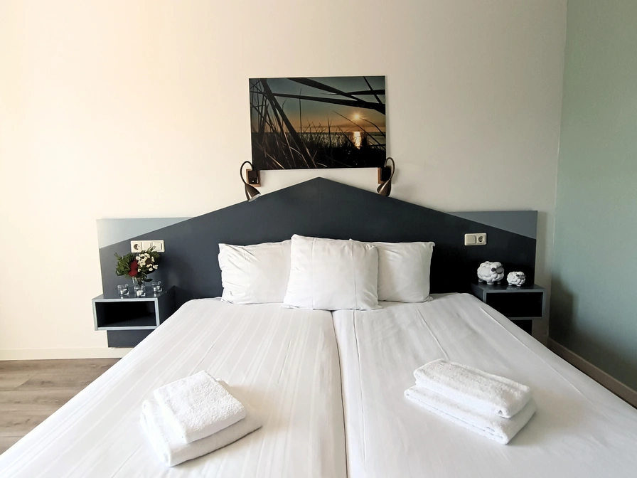 Deze tweepersoonskamer met 2 losse eenpersoonsbedden (extra lang), een flatscreen tv, een kledingkast, een bureau, kluisje en een zitje. Je beschikt over een eigen waterkoker en koffiezetapparaat. De kamer heeft een badkamer met douche, wastafel en toilet.