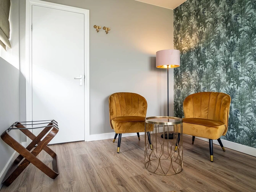 Het splinternieuwe paradepaardje van ons hotel is de Tuin Suite. Je verblijft op de benedenverdieping in een zeer ruime en stijlvolle suite. En zodra je de deur uitloopt, sta je in de tuin met wijds uitzicht over het prachtige natuurgebied de Roggesloot. De Tuin Suite is een lichte royale suite met warme kleuren en speelse details, die een huiselijk en behaaglijk gevoel geeft.