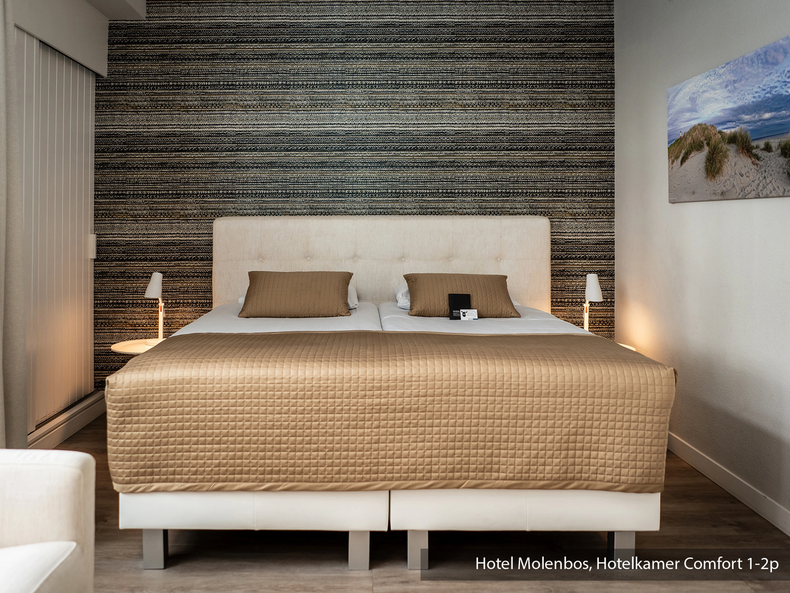 Hotel Molenbos heeft 27 kamers die stuk voor stuk zijn gestyled in de kleuren van het eiland. Deze ruime kamer heeft een tweepersoons boxspringbed met een Swiss sense matras. In de kamer is een kleine zithoek, een flatscreen tv, radio, kluisje en een koelkastje. De badkamer heeft een bad, douche en toilet. Je beschikt over een eigen balkon met zitje.