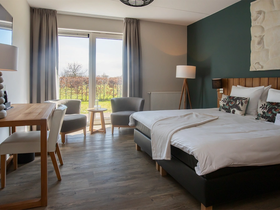 De Deluxe kamer is voorzien van boxspringbedden met Texeler dekbed en een zitje, tv en bureau. De badkamer heeft een regendouche, wastafel, toilet, toilet artikelen, een scheerspiegel, föhn en luxe badjassen en sloffen. Je hebt uitzicht over de tuin of de landerijen rond het hotel. De kamer is gelegen op de begane grond en heeft een terras.