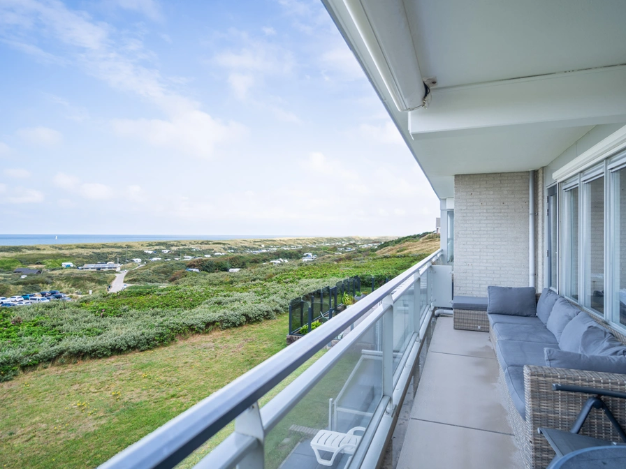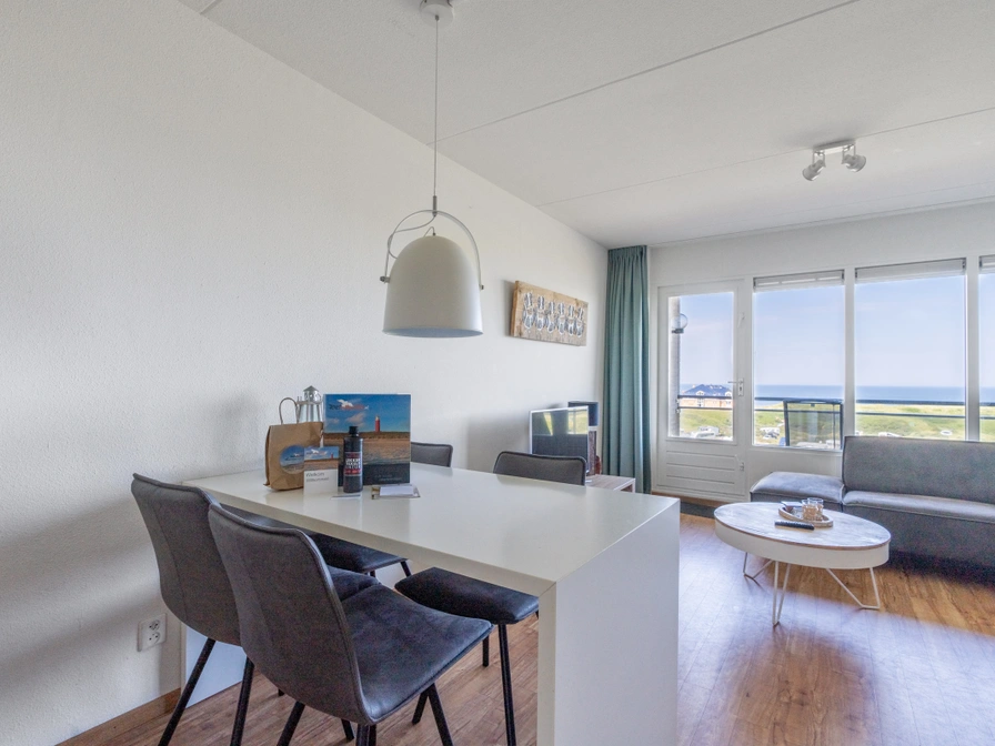 Modern 4 persoons appartement op de 1e etage, met luxe badkamer en een balkon met uitzicht over de duinen en de Noordzee. De gezellige woonkamer heeft een zithoek met tv en een eethoek met eettafel voor 4 personen. De nette open keuken is van alle gemakken voorzien is zoals een vaatwasser, inductiekookplaat, combimagnetron en verschillende koffiemachines. Er zijn 2 slaapkamers aanwezig. De grootste slaapkamer heeft een comfortabel 2 persoons boxspringbed, vanuit bed heb je een prachtig uitzicht op de Noordzee. De andere slaapkamer heeft twee 1 persoons boxspringbedden. De nette badkamer heeft een ruime inloopdouche en een wastafel. Het toilet is apart gesitueerd. Het appartement heeft een ruim balkon met een prachtig uitzicht over de duinen en de Noordzee. Het balkon is voorzien van tuinmeubilair.