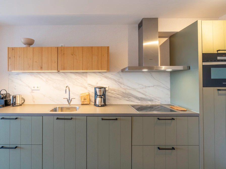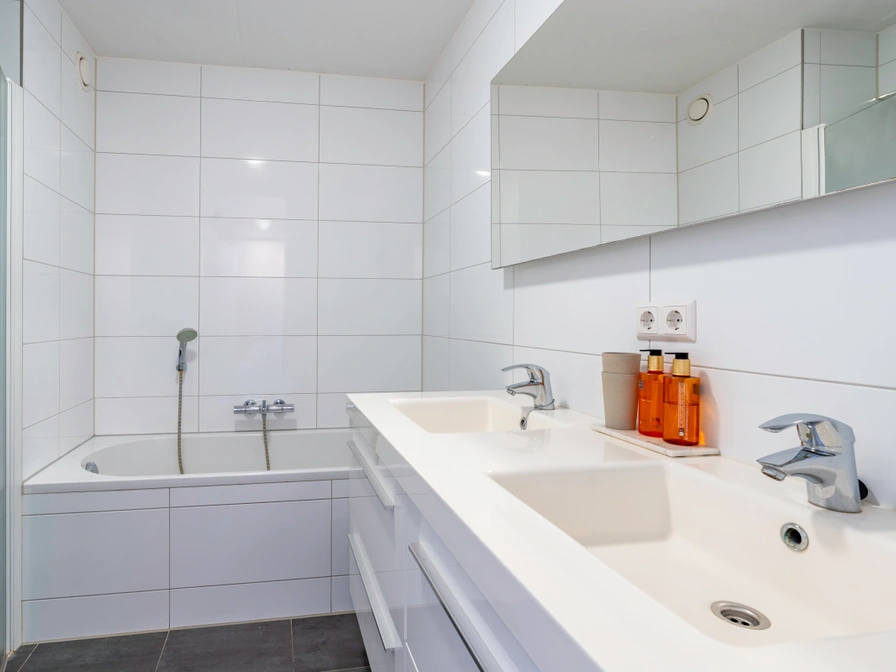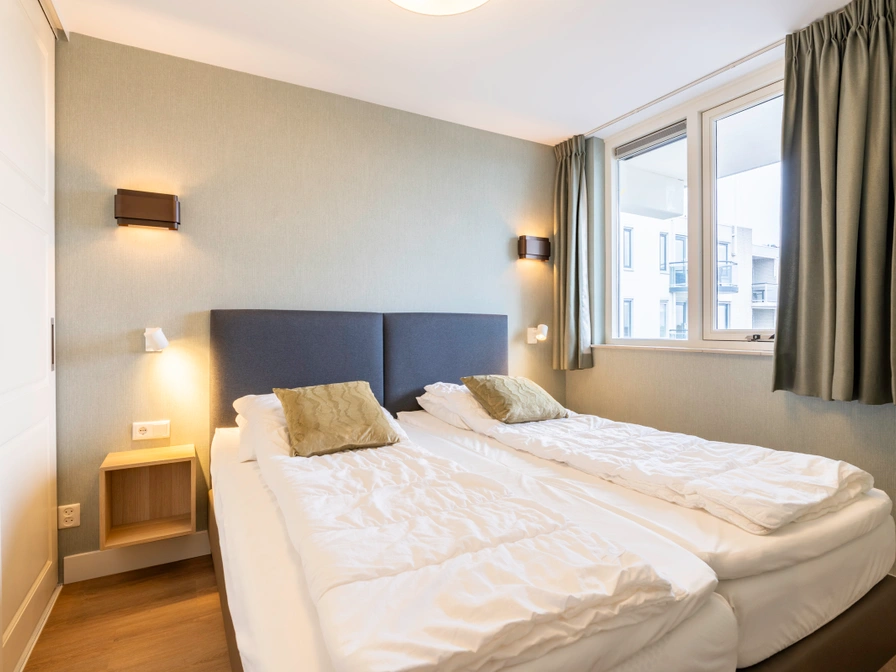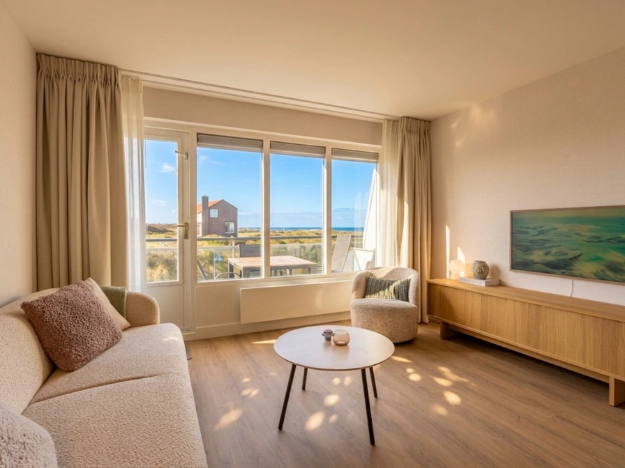 Appartement op de 1e etage. Entree, ruime woonkamer met een zithoek, TV en een eethoek met eettafel voor 4 personen. De nette open keuken is van alle gemakken voorzien zoals een vaatwasser, koelvriescombinatie, combimagnetron en verschillende koffiezetapparaten. Er zijn twee slaapkamers aanwezig welke beide zijn voorzien van 2 eenpersoons boxspring bedden. Eén slaapkamer ligt in het midden van het appartement waardoor er geen raam met zicht naar buiten aanwezig is. De nette badkamer is uitgerust met een ligbad, douche en dubbele wastafel. Het toilet is apart gesitueerd. Vanaf het balkon heb je een prachtig uitzicht over de Noordzee, de duinen en badplaats de Koog. Er is standaard tuinmeubilair aanwezig.