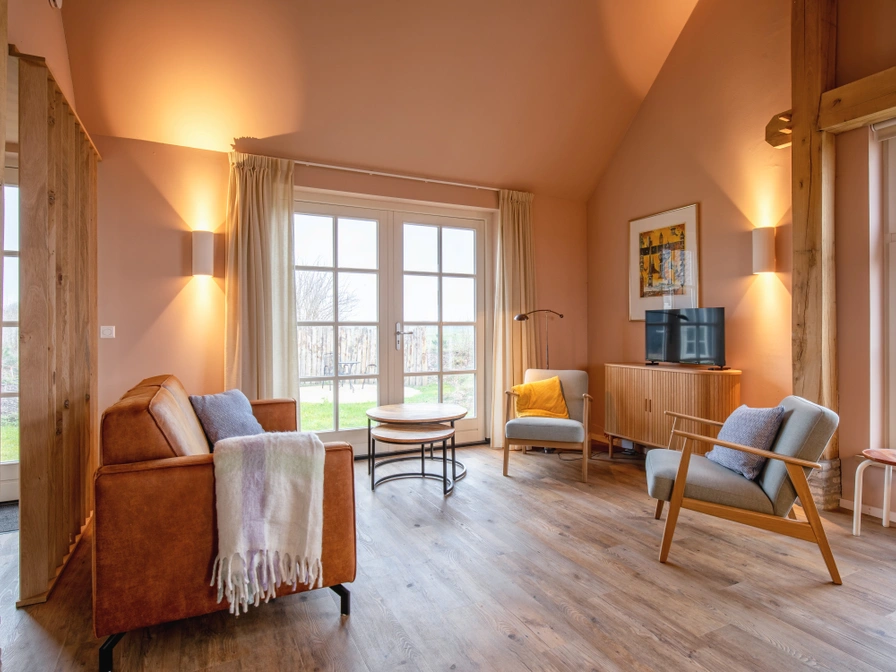 Entree in de woonkamer met open keuken. Zithoek met TV. Open keuken met inductiekookplaat, filterkoffiezetapparaat en combi-magnetron. Twee slaapkamers met elk 2 eenpersoonsbedden (0,90 x 2,00) en kledingrek. Badkamer met douche en wastafel. Separaat toilet. Openslaande deuren naar het terras en de tuin.