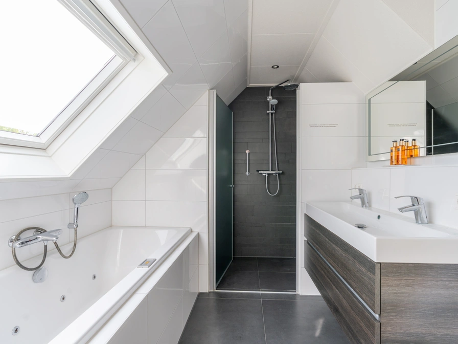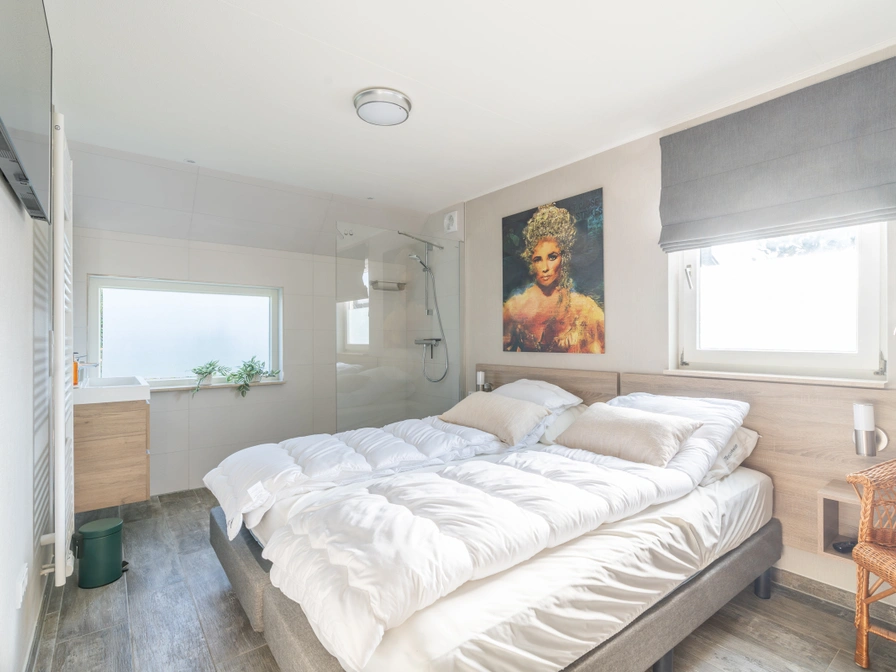 De woonkamer van dit vrijstaande vakantiehuis heeft een zithoek met tv en muziekinstallatie. Tevens is er een eethoek met eettafel voor 6 personen. De open keuken is ingericht met vaatwasser en combimagnetron en verschillende koffiezetapparaten. Er is een apart toilet aanwezig. Op de begane grond is een slaapkamer met 2 eenpersoons bedden, een eigen douche en wastafel. In de berging staan een wasmachine en droger. Op de bovenverdieping zijn twee slaapkamers met elk 2 eenpersoons bedden. Twee slaapkamers hebben een TV. De badkamer boven heeft een whirlpool, inloopdouche met Sun shower en dubbele wastafel. Er is een apart toilet. Dit vakantiehuis heeft een ruime tuin aan het water. Tuinmeubilair is aanwezig.